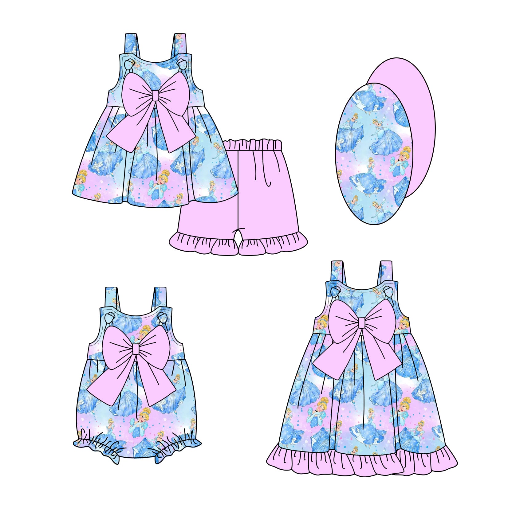 1.6(Custom Design Preorder MOQ 5 Each Design) Cartoon Princess Blue Print Girls Summer Matching Clothes Sisters Wear