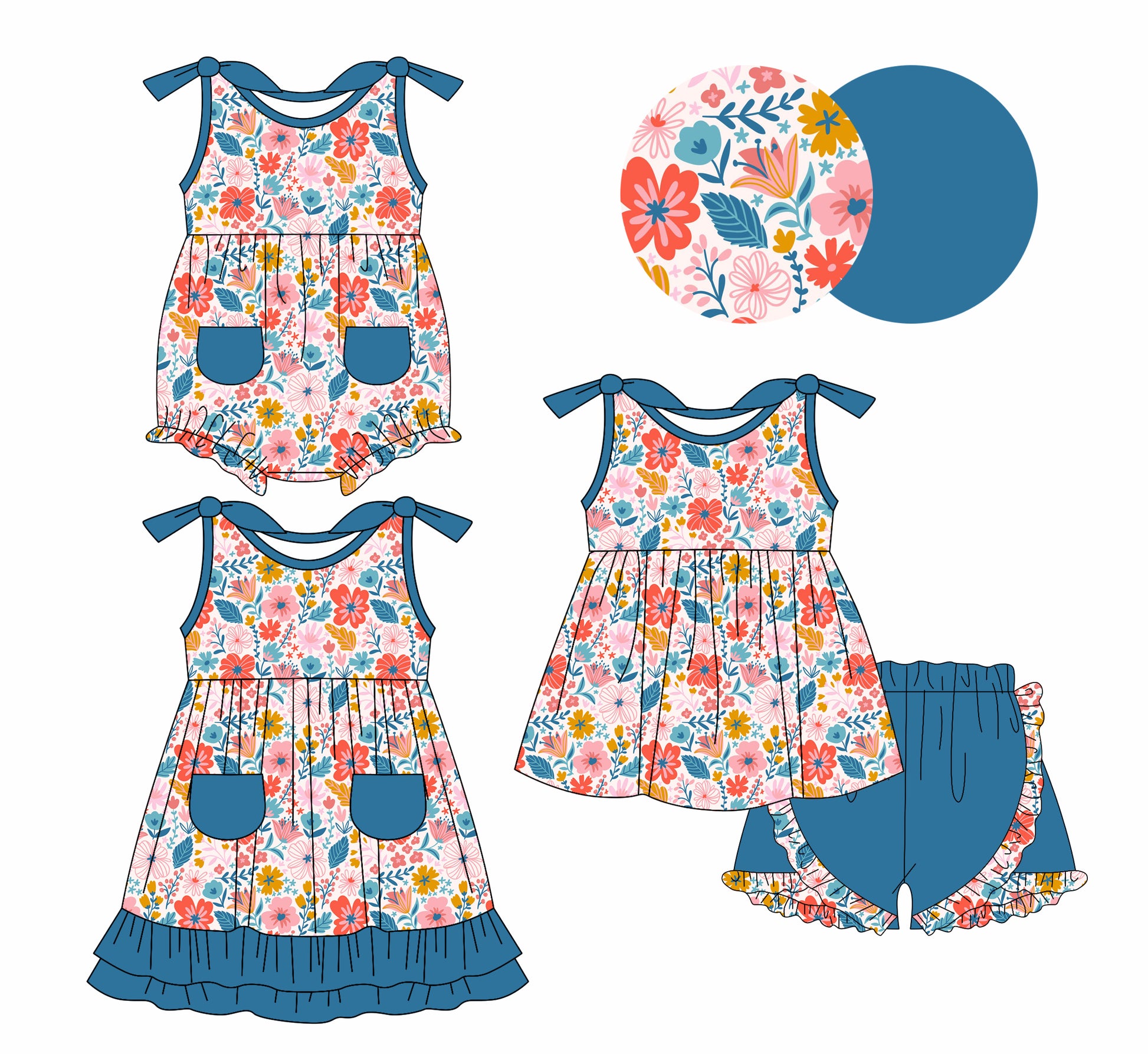 1.7(Custom Design Preorder MOQ 5 Each Design) Flowers Blue Pink Print Girls Summer Matching Clothes Sisters Wear