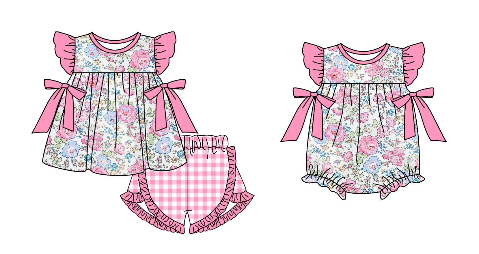11.4(Custom Design Preorder MOQ 5 Each Design) Pink Flowers Print Girls Summer Matching Clothes Sisters Wear