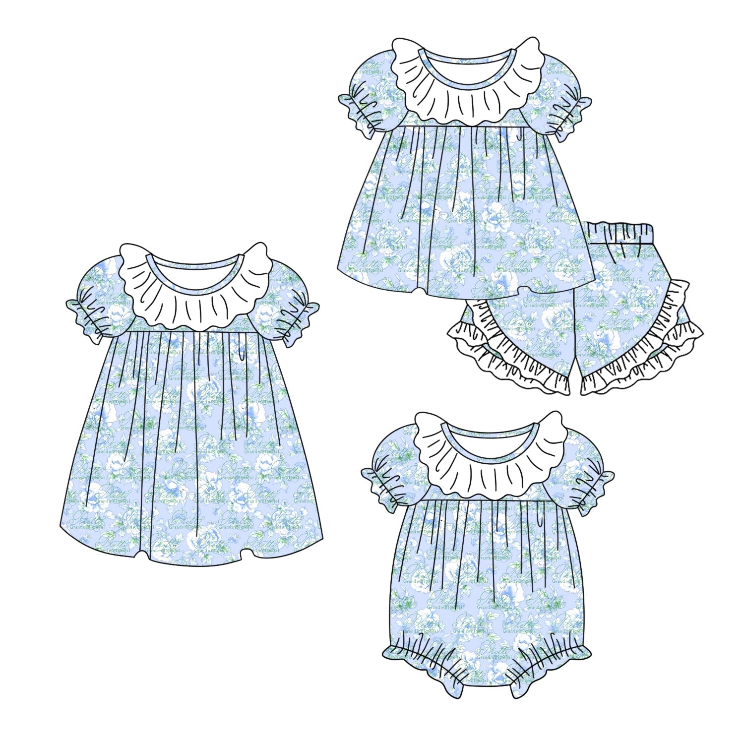 11.4(Custom Design Preorder MOQ 5 Each Design) Blue Flowers Print Girls Summer Matching Clothes Set Sisters Wear