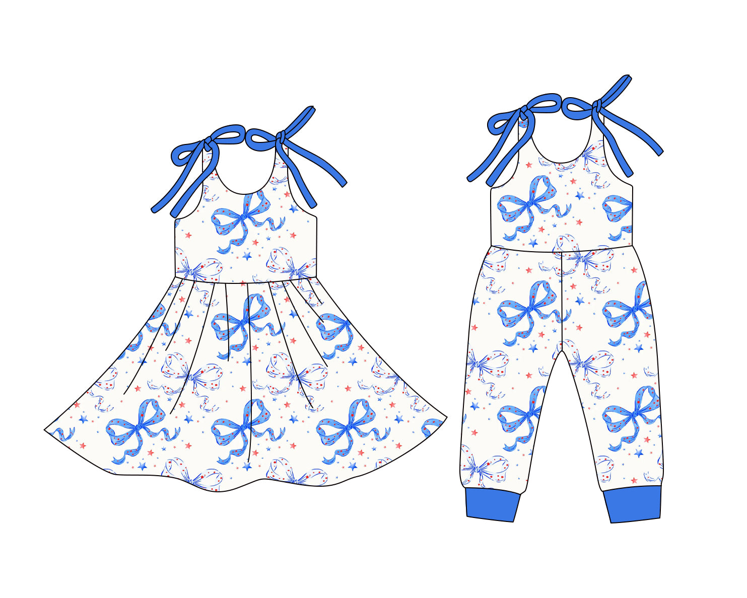 12.24 (Custom Design Preorder MOQ 5 Each Design) Bows Stars Print Girls 4th of July Matching Clothes Sisters Wear