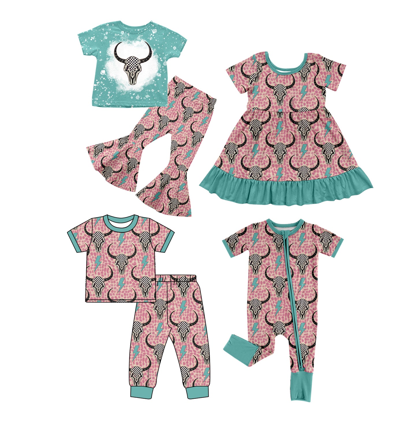 12.9(Custom Design Preorder MOQ 5 Each Design) Cow Skull Leopard Print Girls Western Matching Clothes Sisters Wear