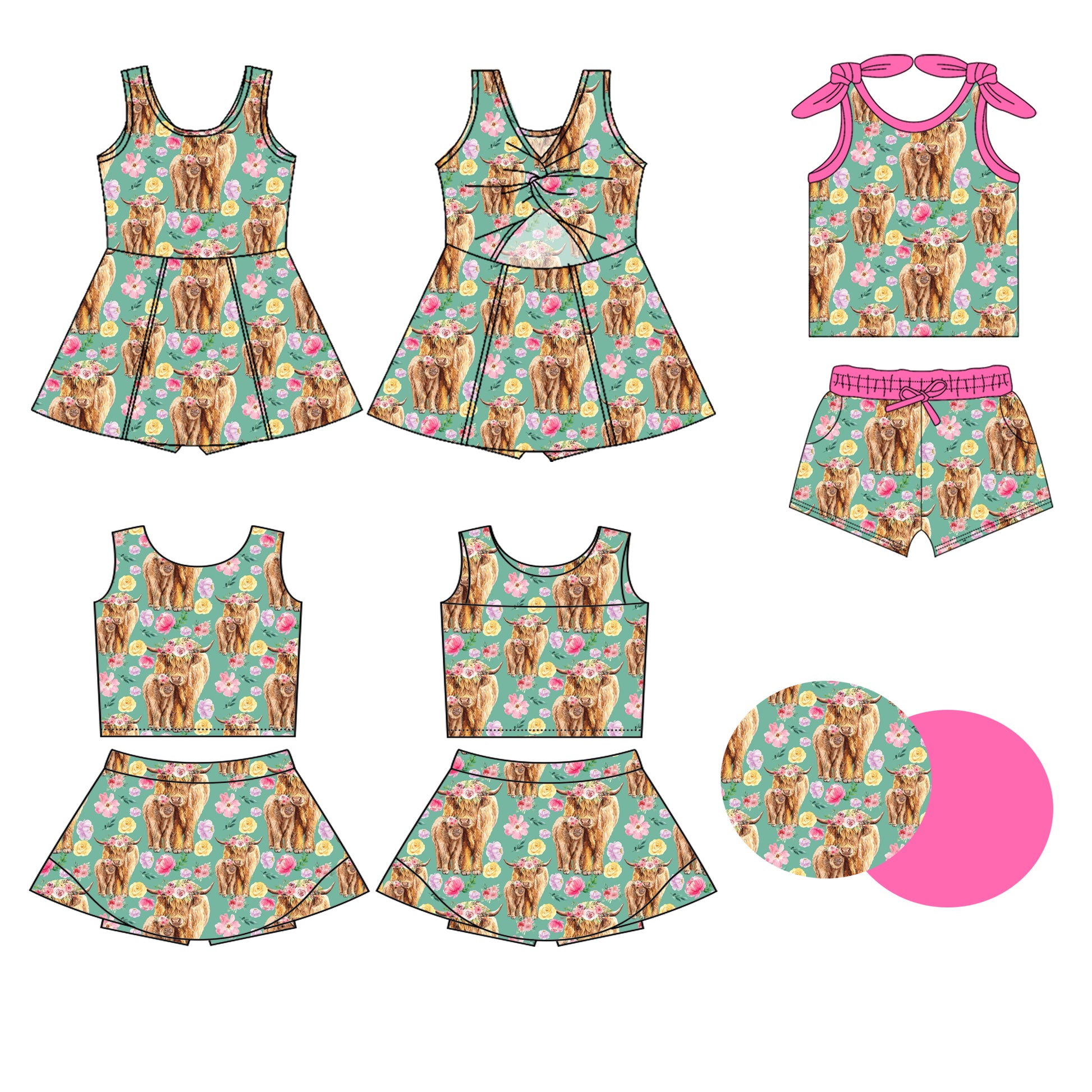 2.20(Custom Design Preorder MOQ 5 Each Design) Highland Cow Flowers Print Girls Summer Matching Clothes Sisters Wear