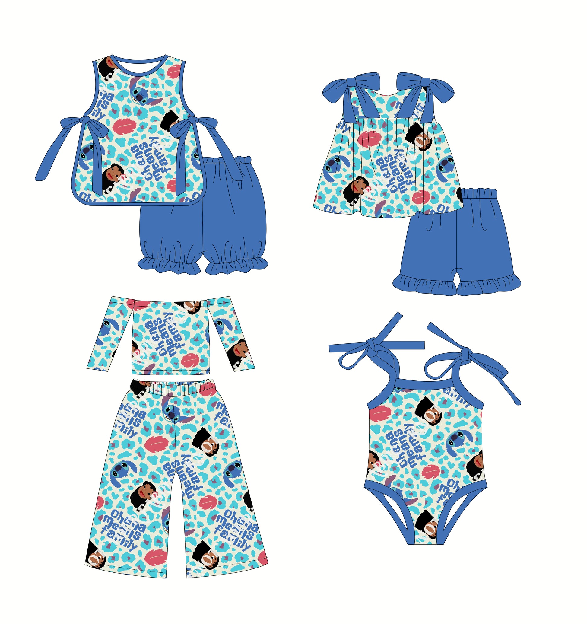 2.22(Custom Design Preorder MOQ 5 Each Design) Cartoon Princess Moan* Blue Leopard Print Girls Summer Matching Clothes Sisters Wear
