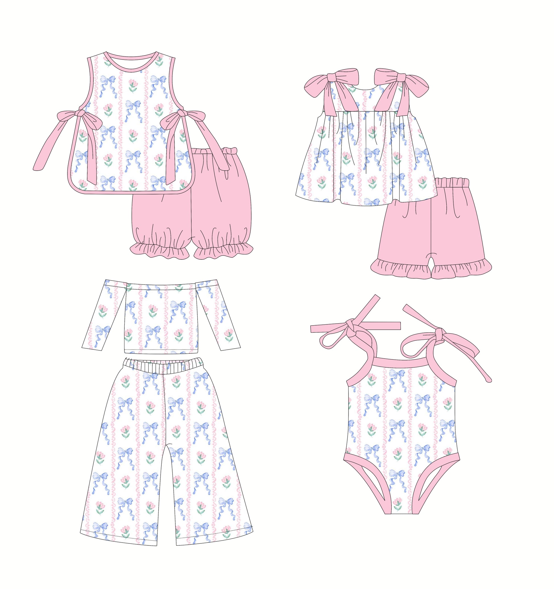 2.22(Custom Design Preorder MOQ 5 Each Design) Flowers Blue Bows Print Girls Summer Matching Clothes Sisters Wear