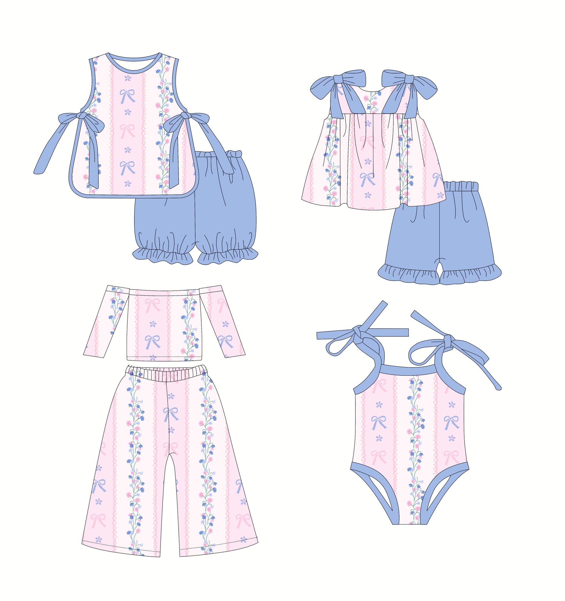 2.22(Custom Design Preorder MOQ 5 Each Design) Flowers Bows Print Girls Summer Matching Clothes Sisters Wear