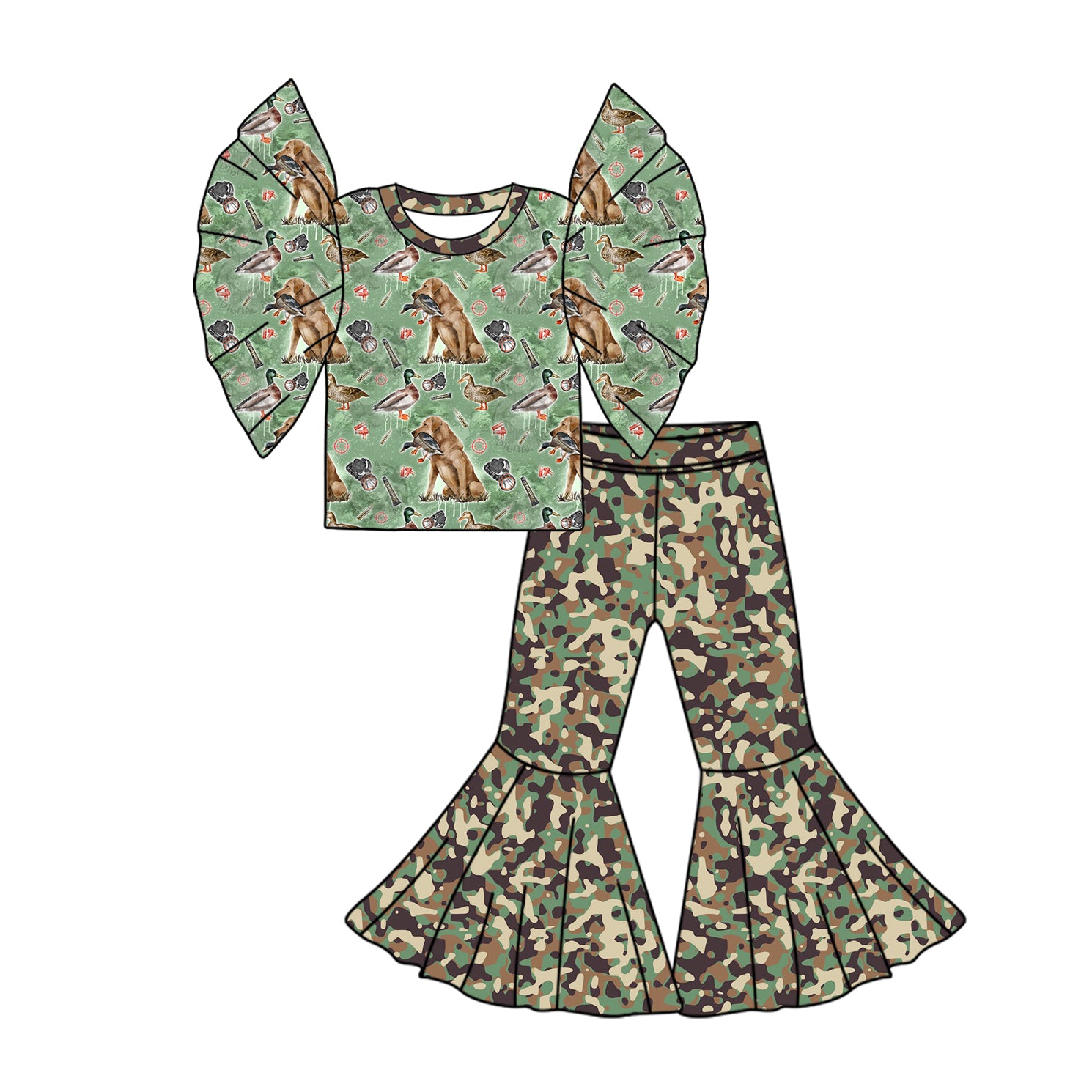 2.24(Custom Design Preorder MOQ 5) Dog Duck Hunting Top Camo Bell Pants Girls Clothes Set