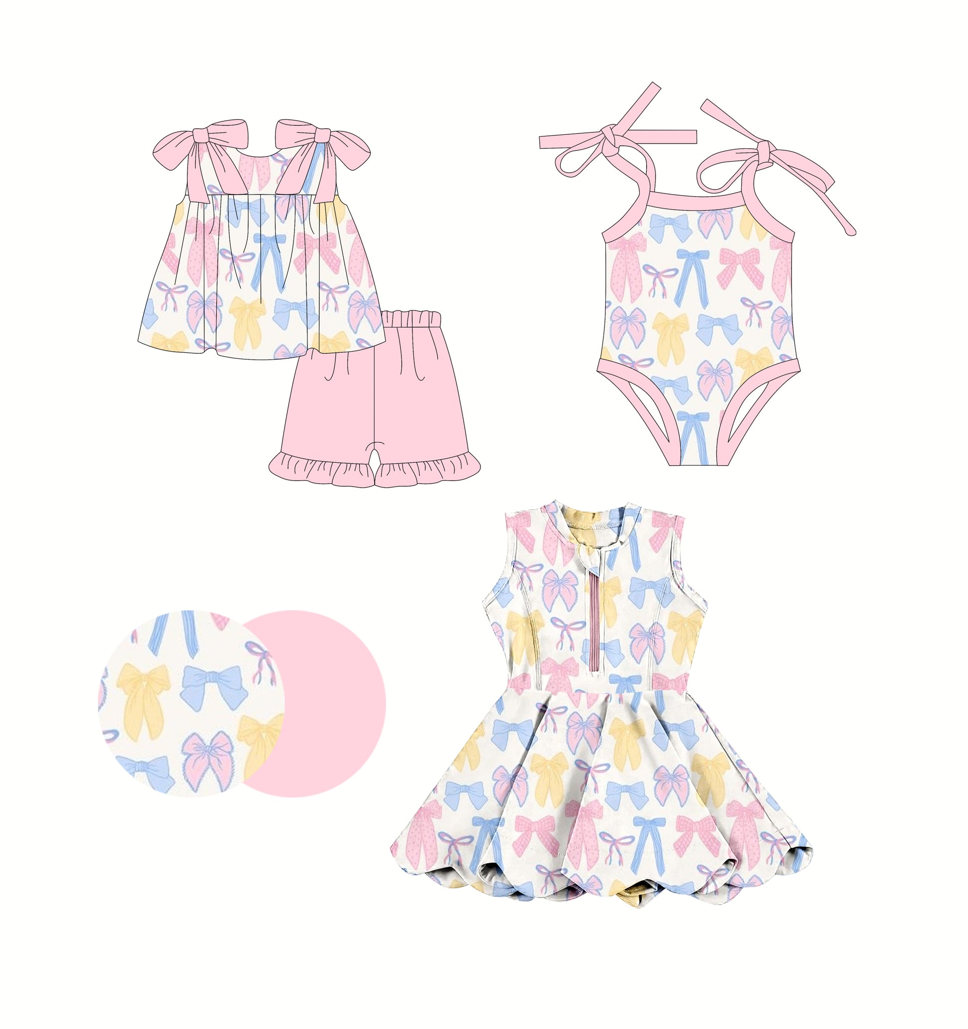 2.24(Custom Design Preorder MOQ 5 Each Design) Colorful Bows Print Girls Summer Matching Clothes Sisters Wear