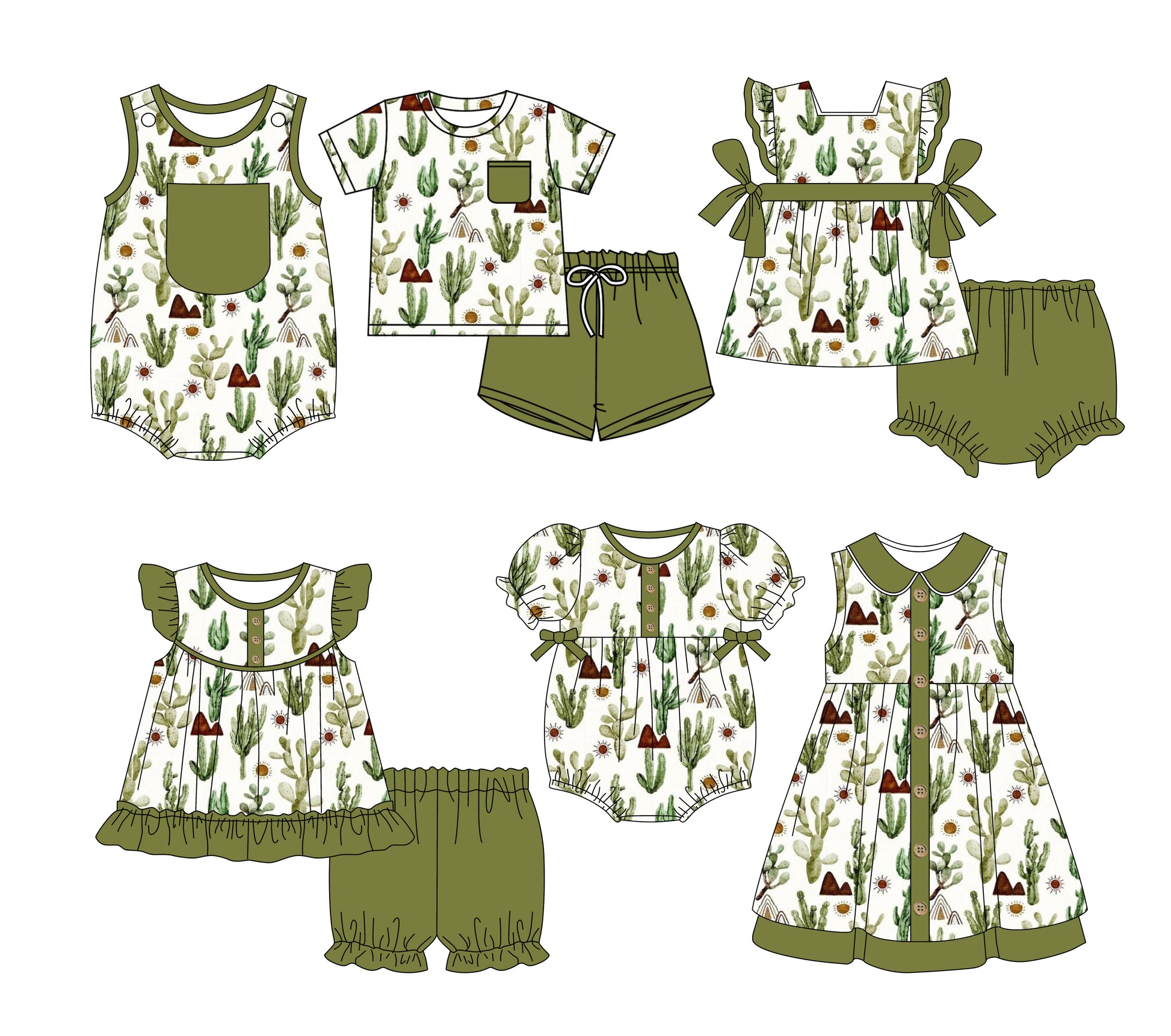 3.3(Custom Design Preorder MOQ 5 Each Design) Cactus Green Print Kids Summer Matching Clothes Sibling Wear