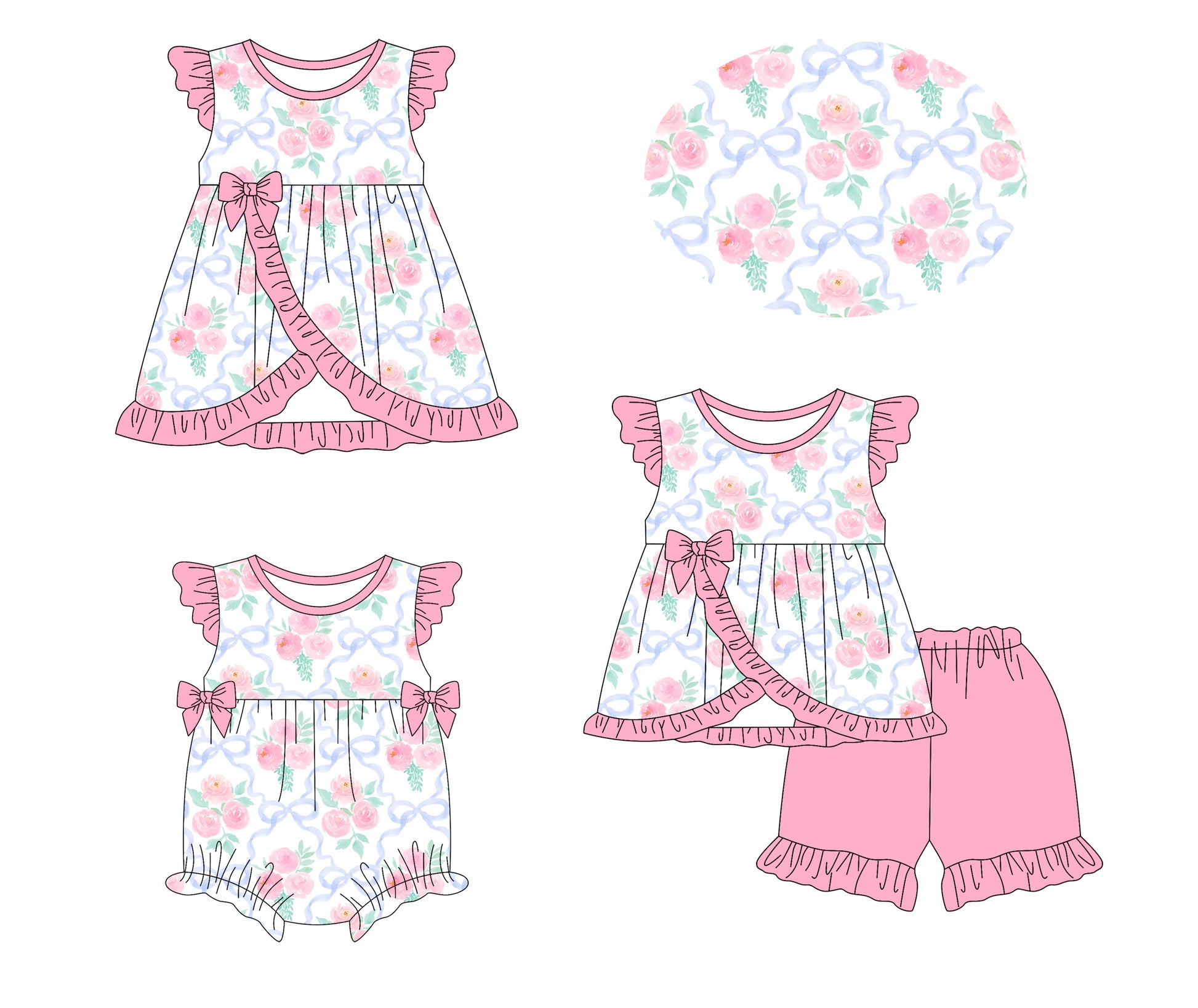 3.8(Custom Design Preorder MOQ 5 Each Design) Flowers Pink Bows Print Girls Summer Matching Clothes Sisters Wear