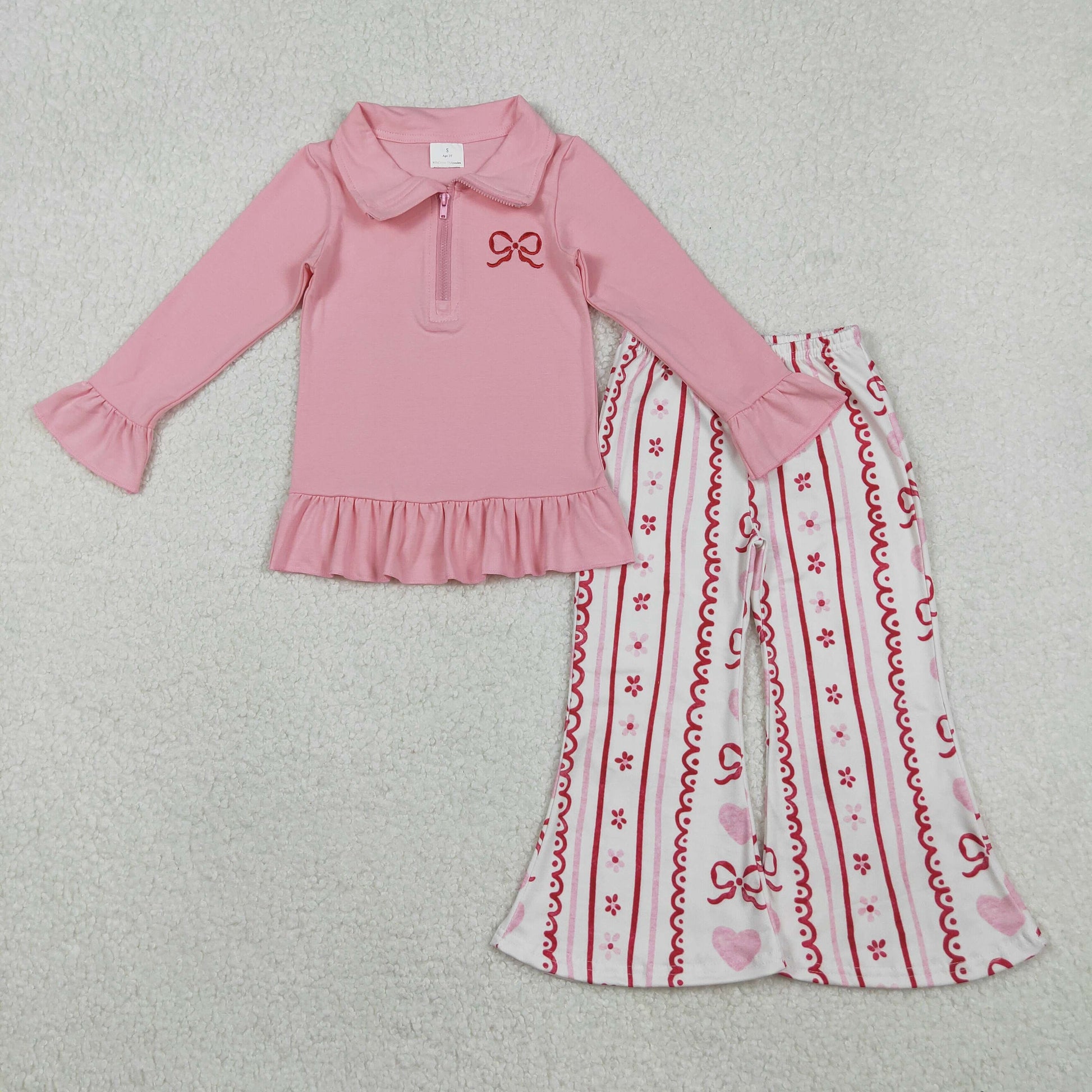 3 Colors Embroidery Zipper Pullover Top Bell Pants Girls Valentine's Day Clothes Set Sisters Wear