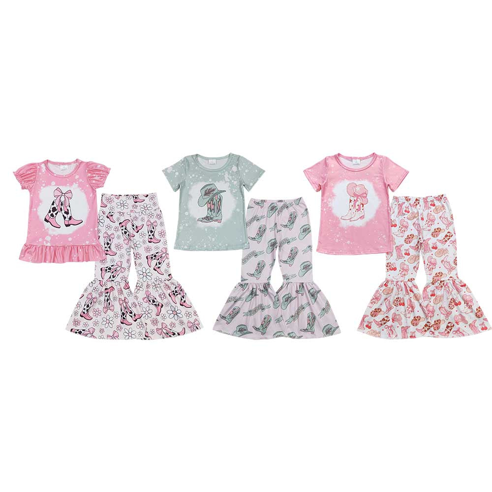 3 Colors Western Boots Print Bell Pants Girls Clothes Set