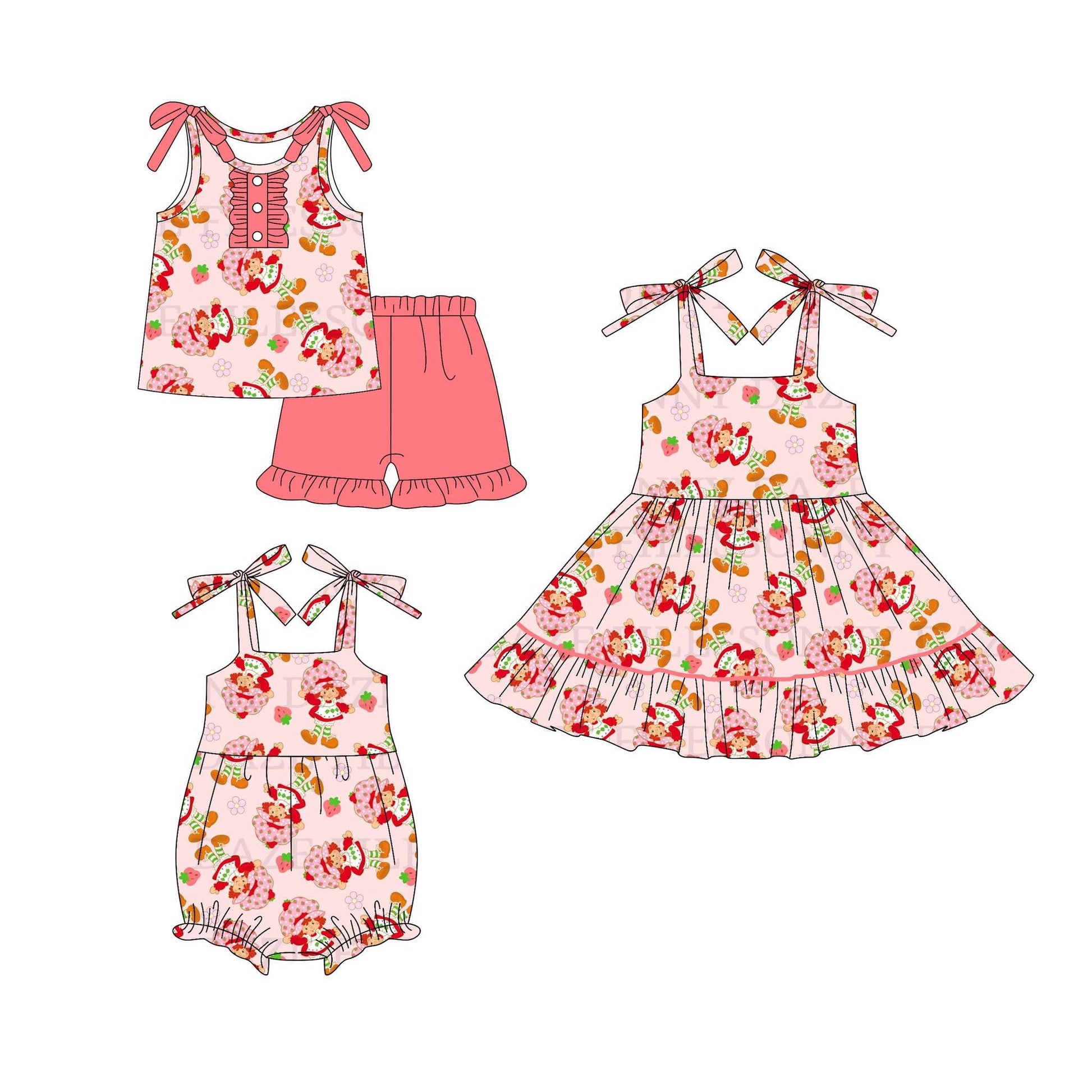 4.16(Custom Design Preorder MOQ 5 Each Design) Strawberry Girl Flowers Print Girls Summer Matching Clothes Sisters Wear