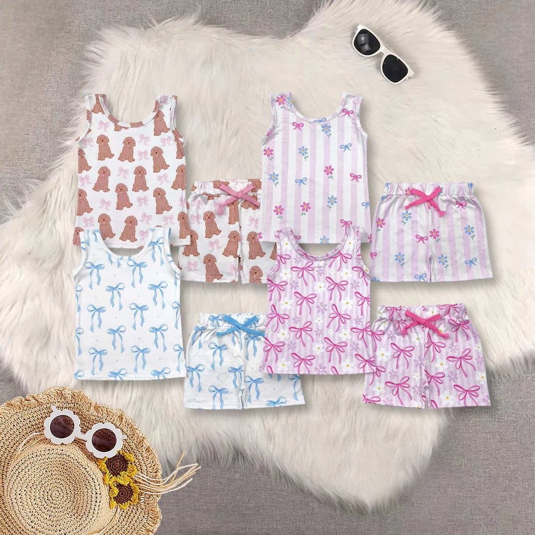 4 Colors Bows Print Tank Top Shorts Girls Summer Clothes Set Sisters Wear
