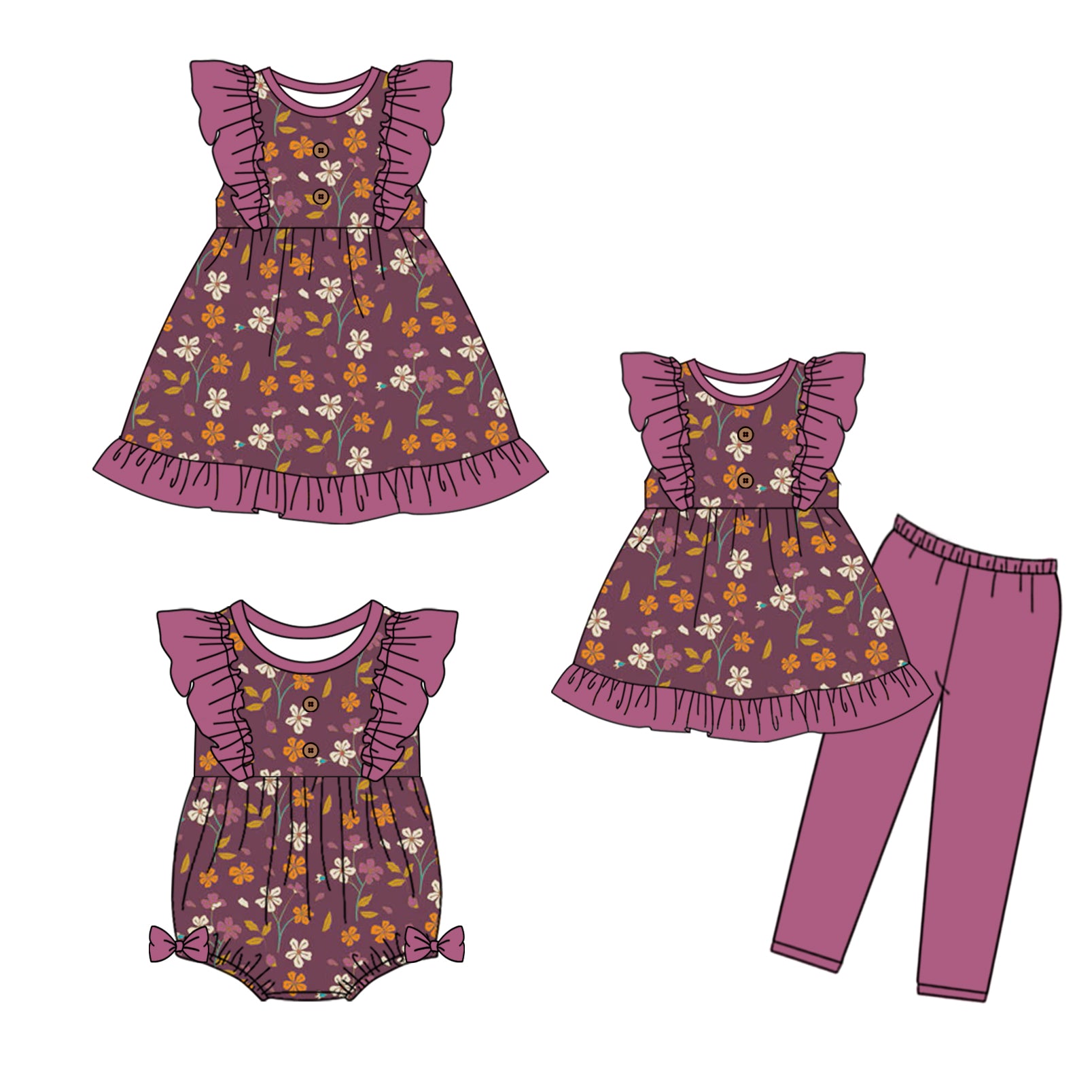 5.1(Custom Design Preorder MOQ 5 Each Design) Purple Flowers Print Girls Fall Matching Clothes Sisters Wear