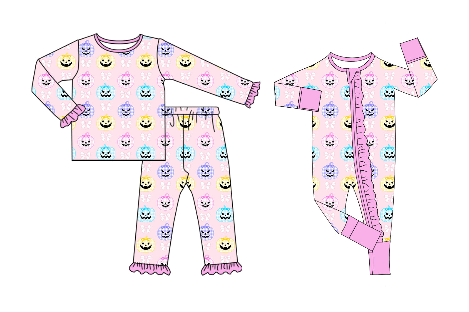 5.21(Custom Design Preorder MOQ 5 Each Design) Colorful Pumpkin Bows Print Girls Halloween Pajamas Matching Clothes Sisters Wear