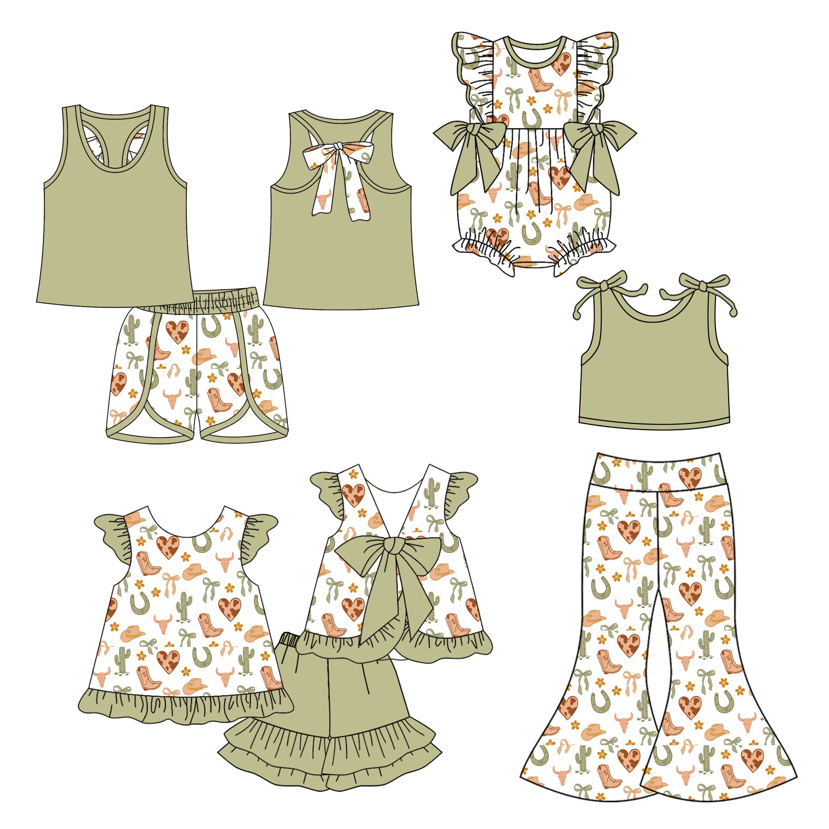 5.6(Custom Design Preorder MOQ 5 Each Design) Boots Hat Cactus Bows Print Girls Summer Western Matching Clothes Sisters Wear
