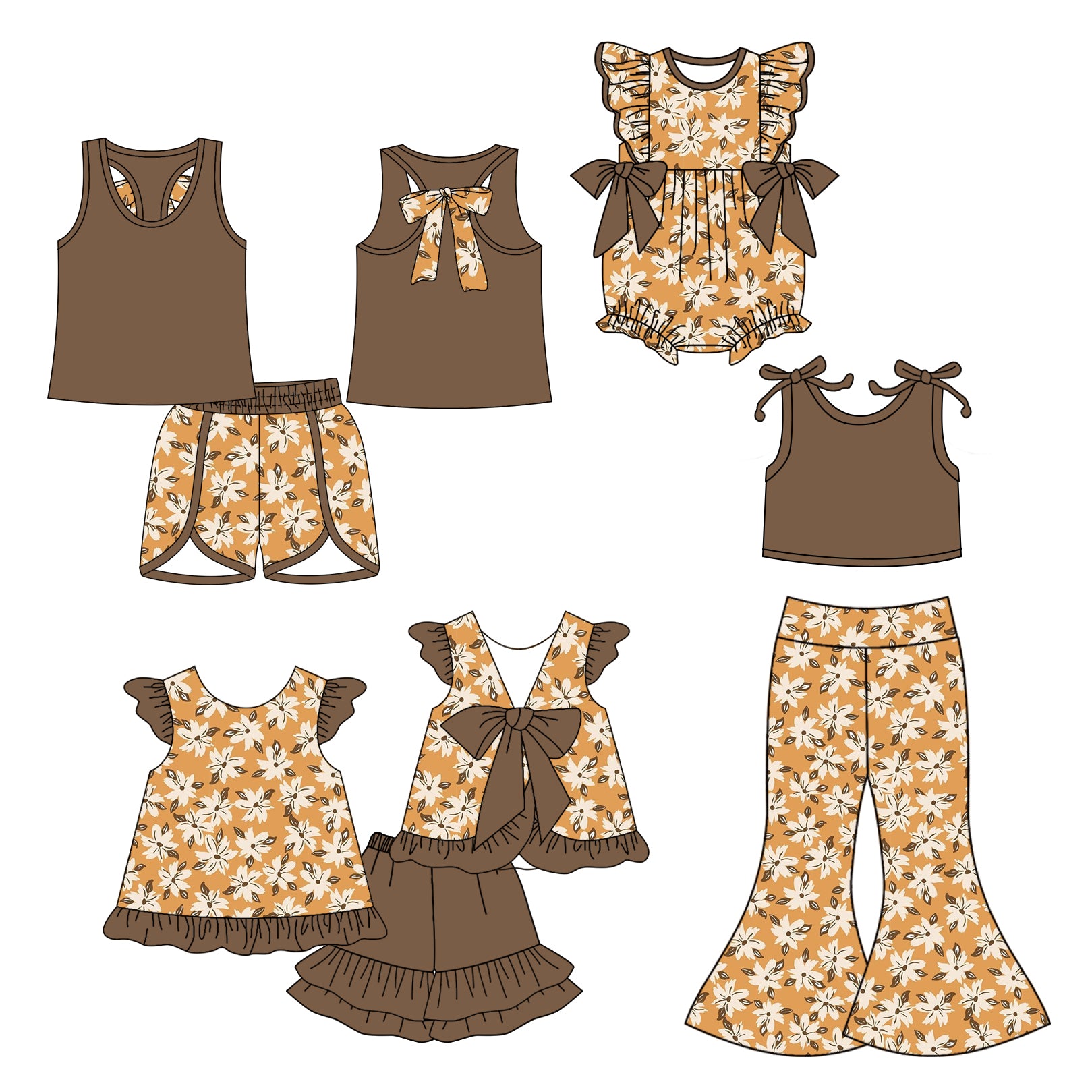 5.6(Custom Design Preorder MOQ 5 Each Design) Flowers Brown Print Girls Summer Matching Clothes Sisters Wear