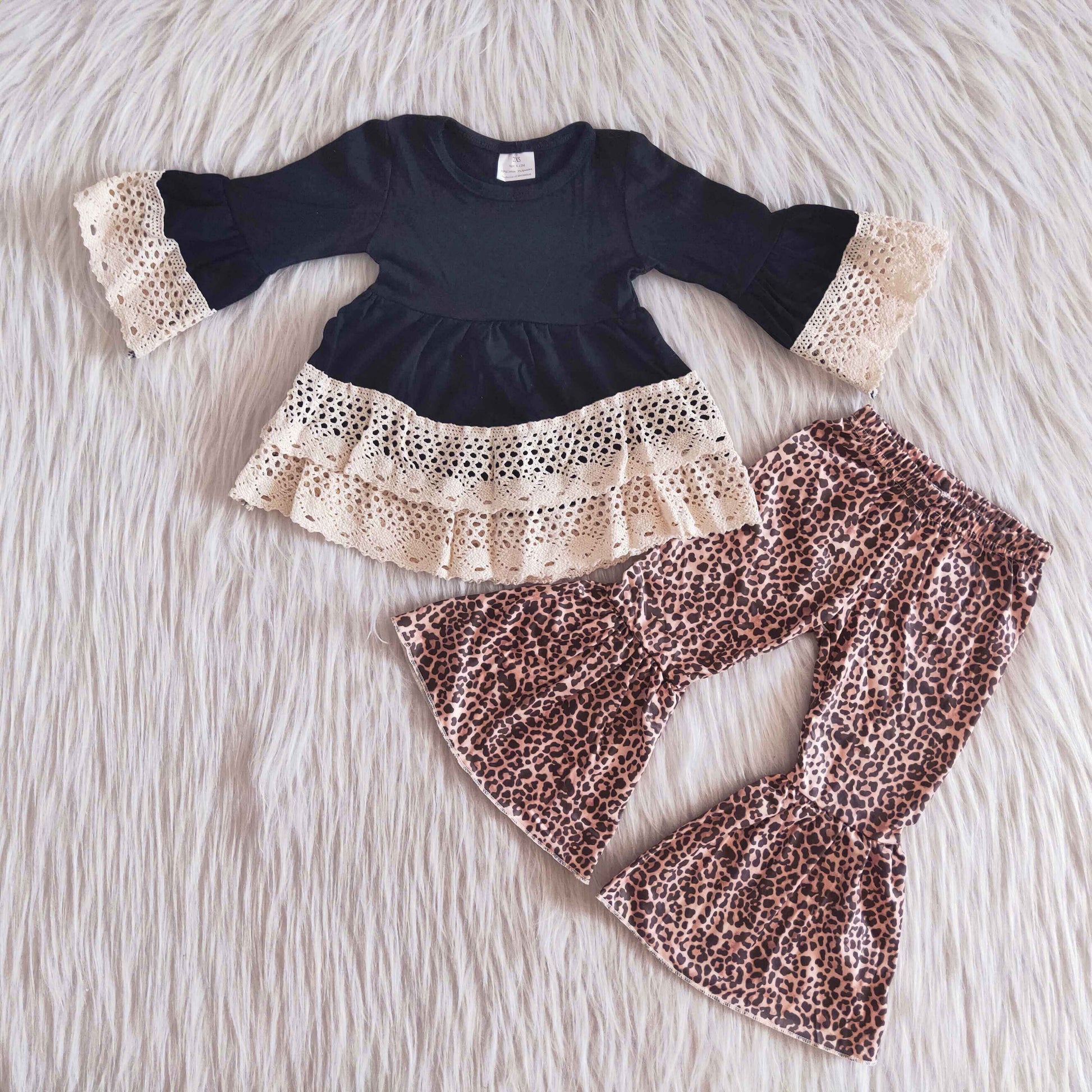 (Promotion)6 A16-30 Black Cotton Lace Ruffles Tunic Top Leopard Bell Pants Girls Fall Outfits