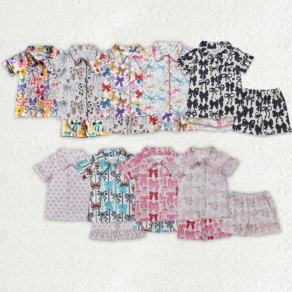 9 Colors Bows Print Girls Summer Buttons Pajamas Clothes Set Sisters Wear