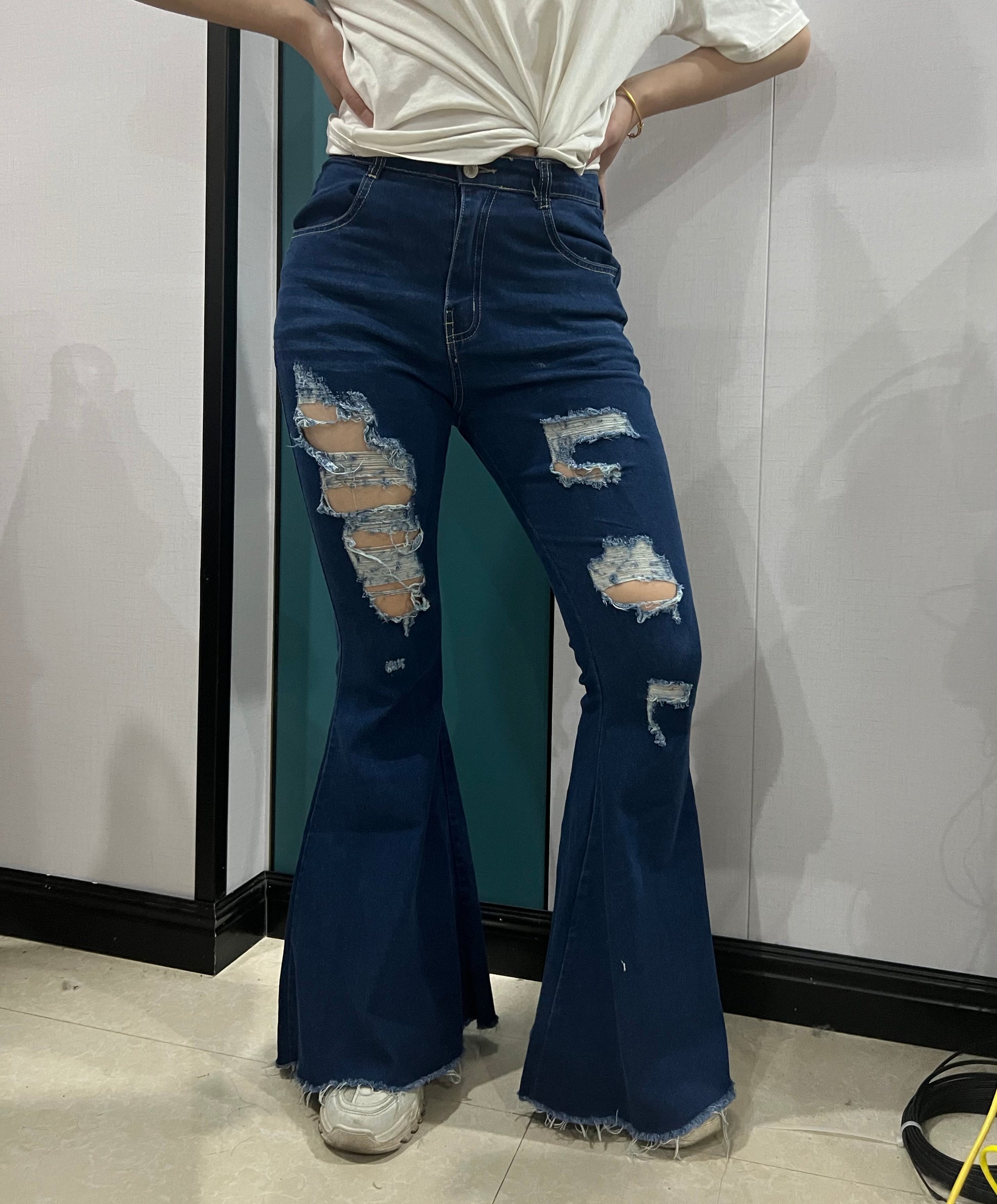 Adult navy denim Hole bell bottom jeans P0118