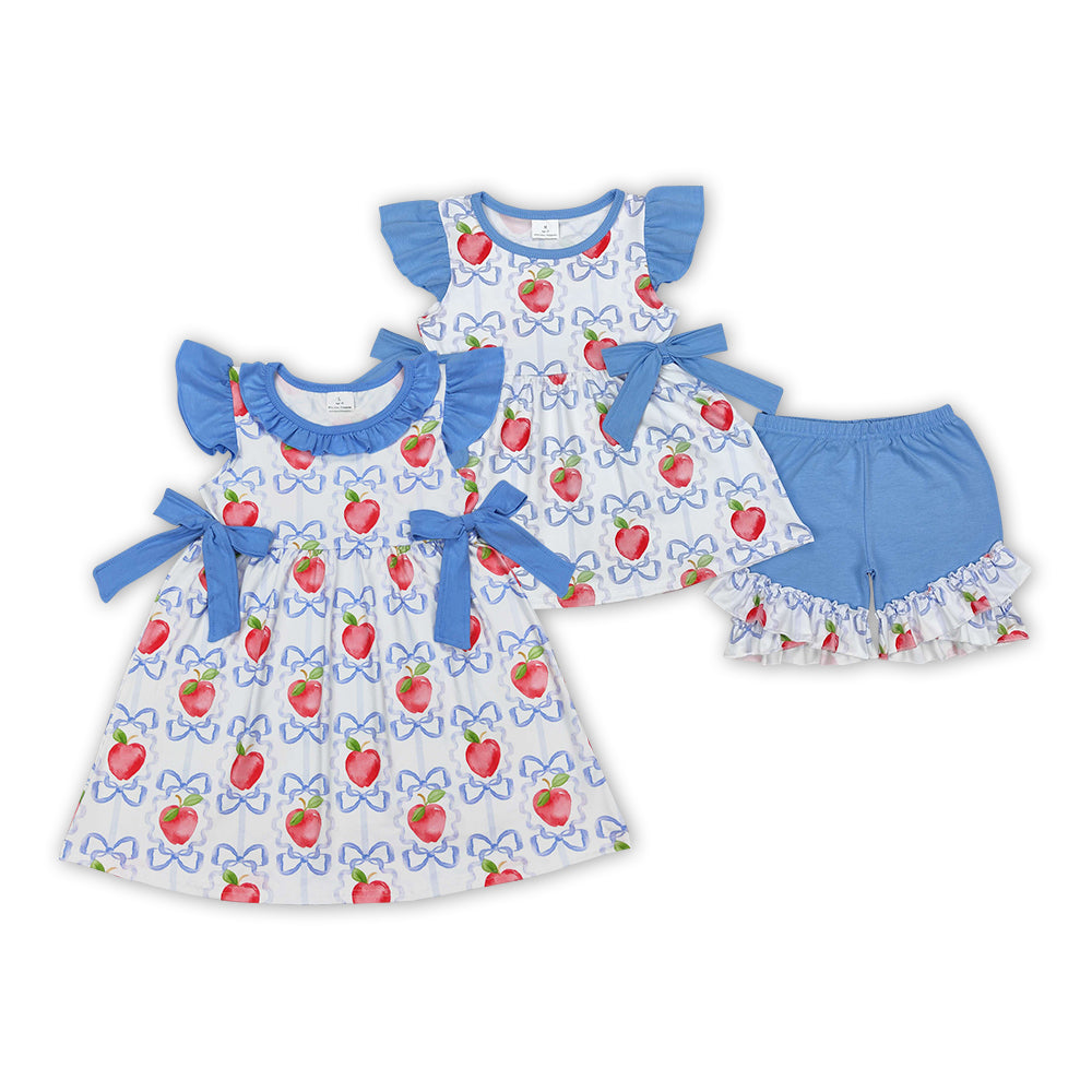 Apple Blue Bows Print Girls Back to School Clothes Sisters Wear