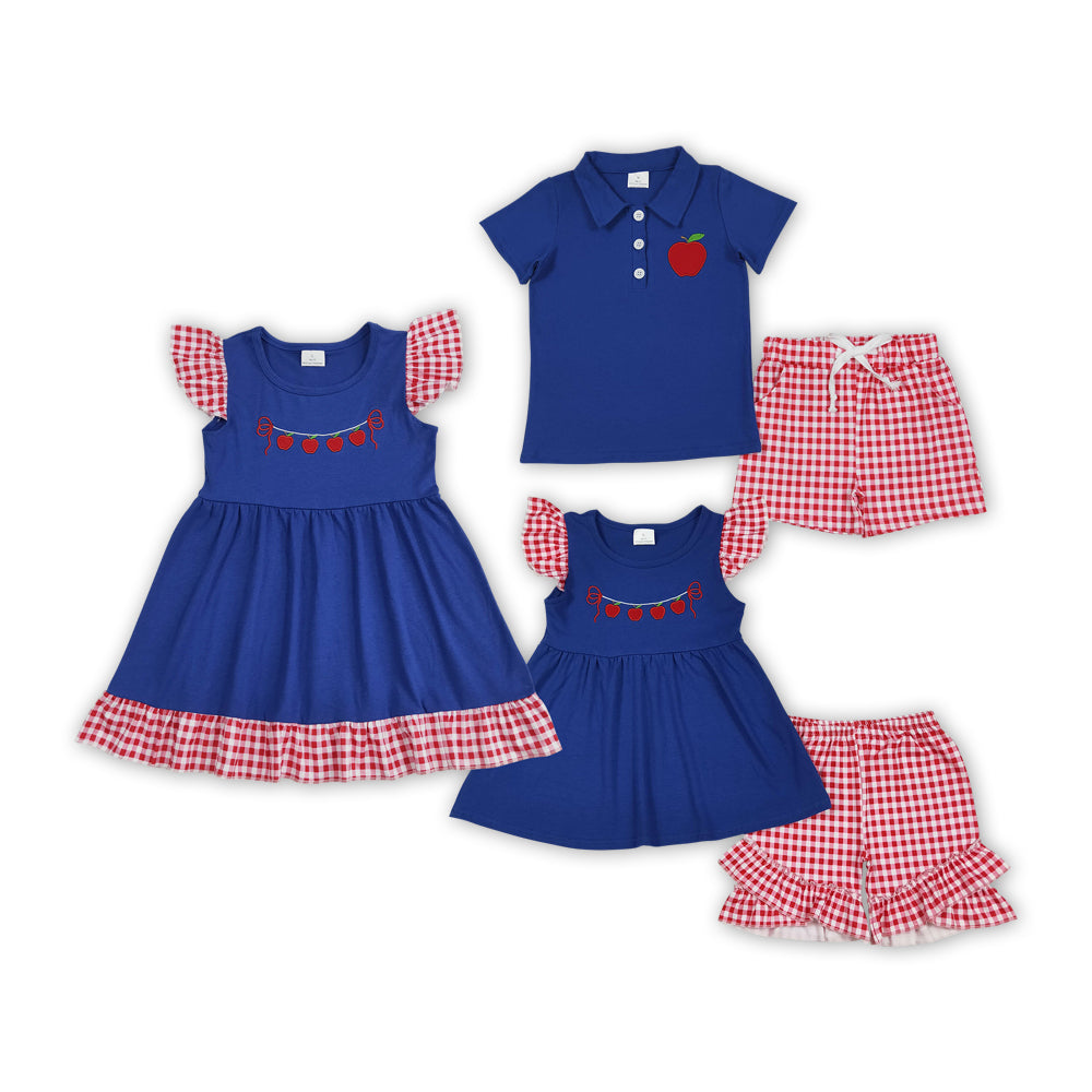 Apple Embroidery Blue Top Red Plaid Shorts Kids Back to School Clothes Sibling Wear