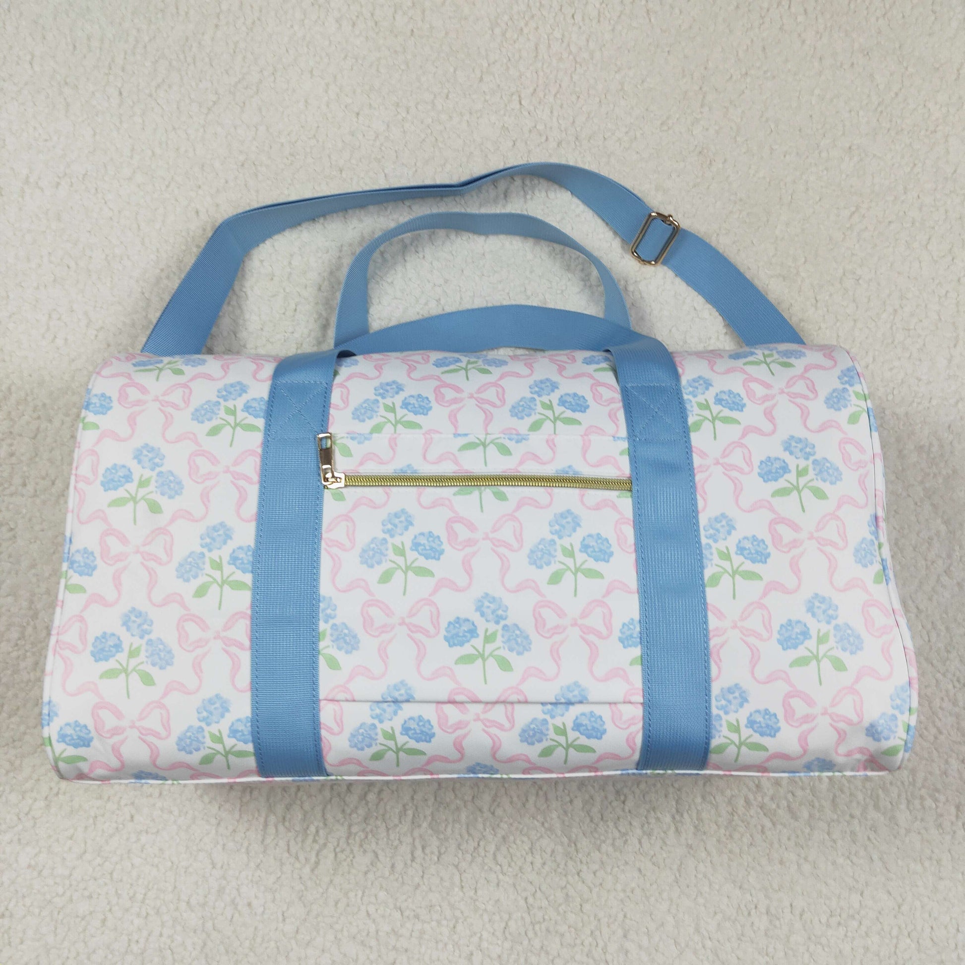 BA0294 Blue Flowers Pink Bows Print Ruffle Gym Bag Overnight Bags