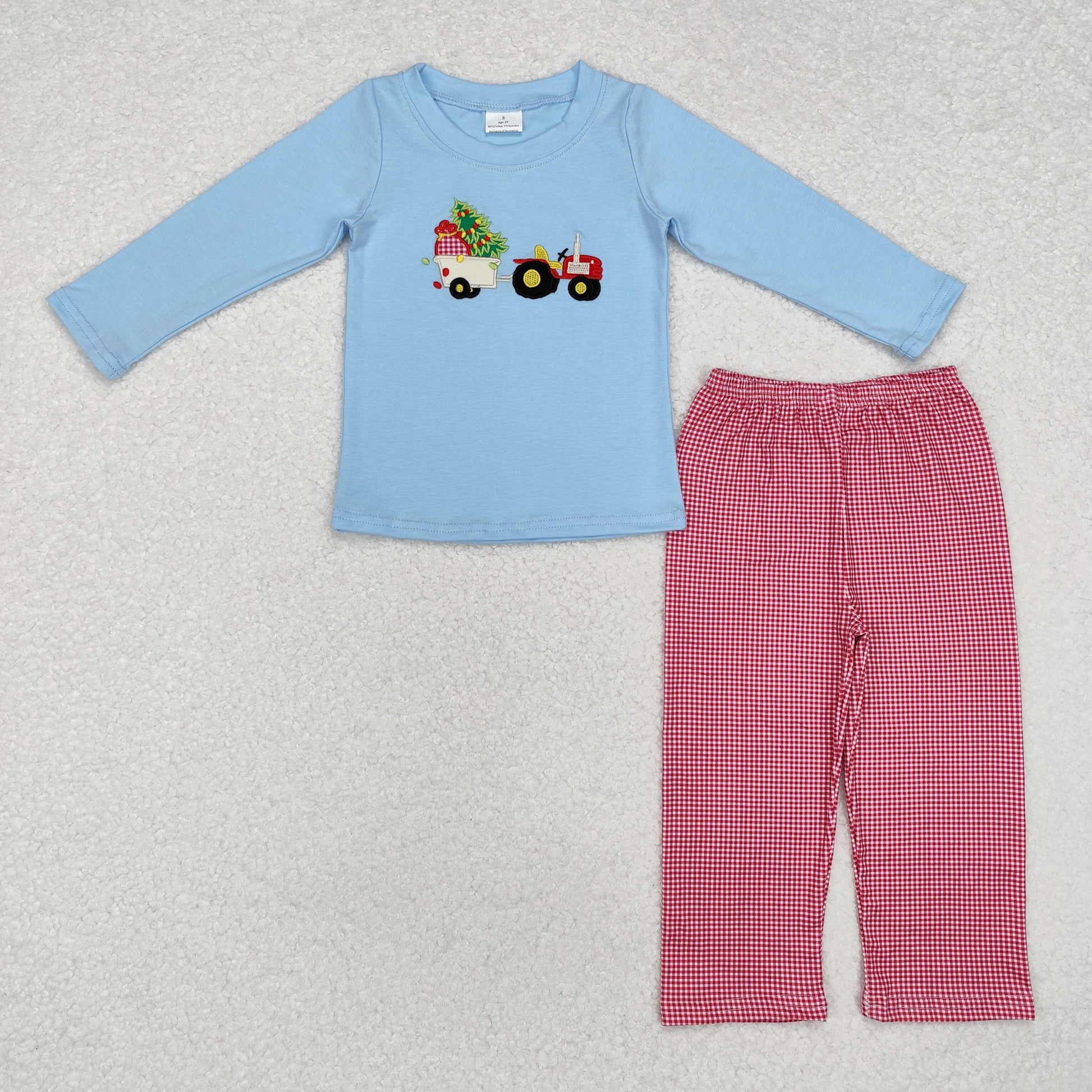 BLP0745 Tractors Tree Embroidery Blue Top Plaid Pants Boys Christmas Clothes Set