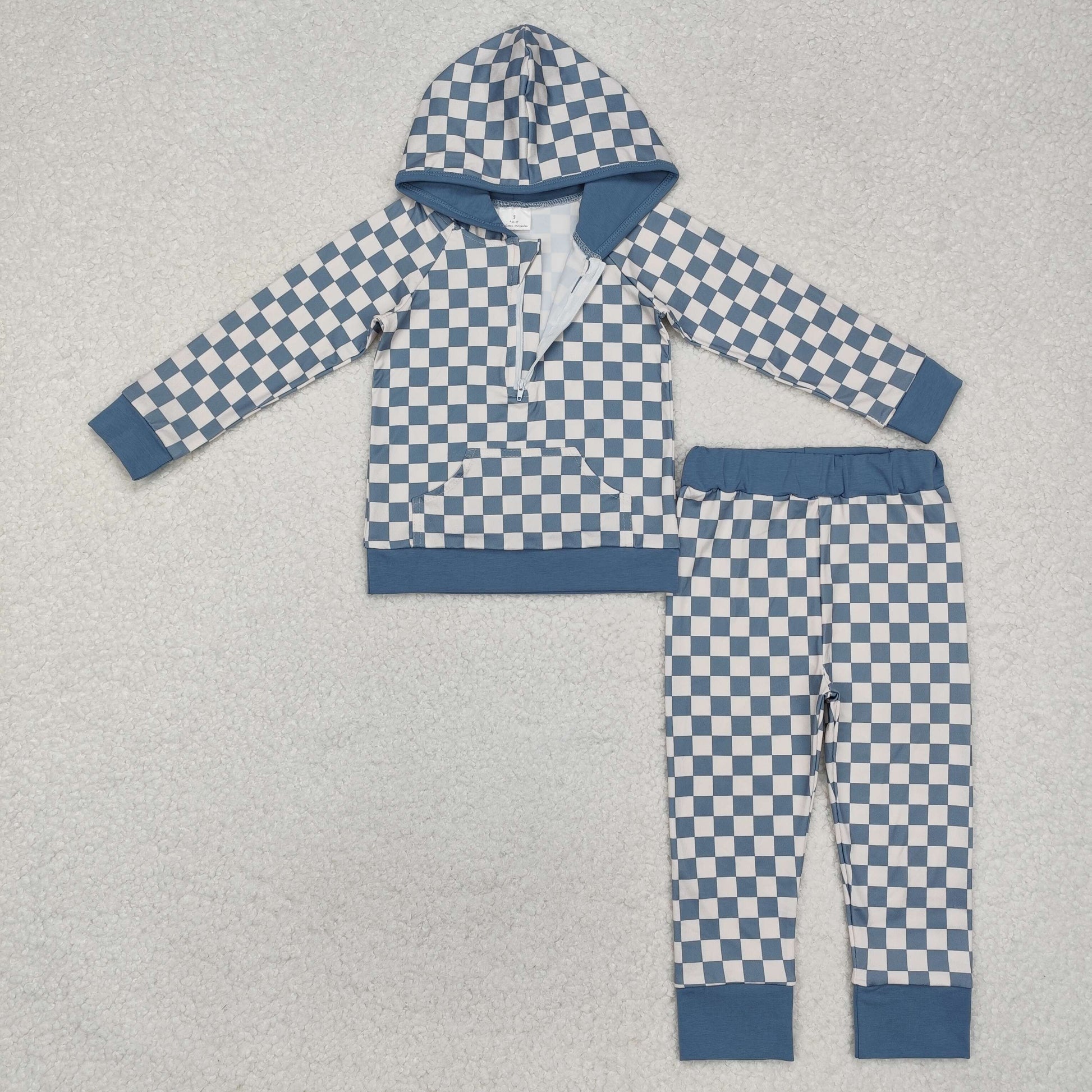 BLP0951 Blue Plaid Hoodie Zipper Top Pants Boys Fall Clothes Set