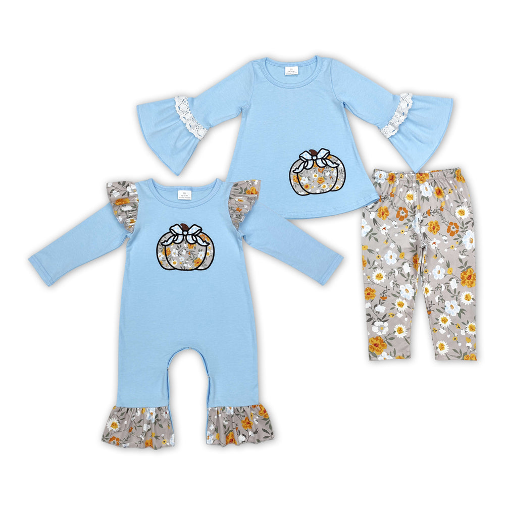 Blue Pumpkin Embroidery Flowers Print Sisters Fall Matching Clothes