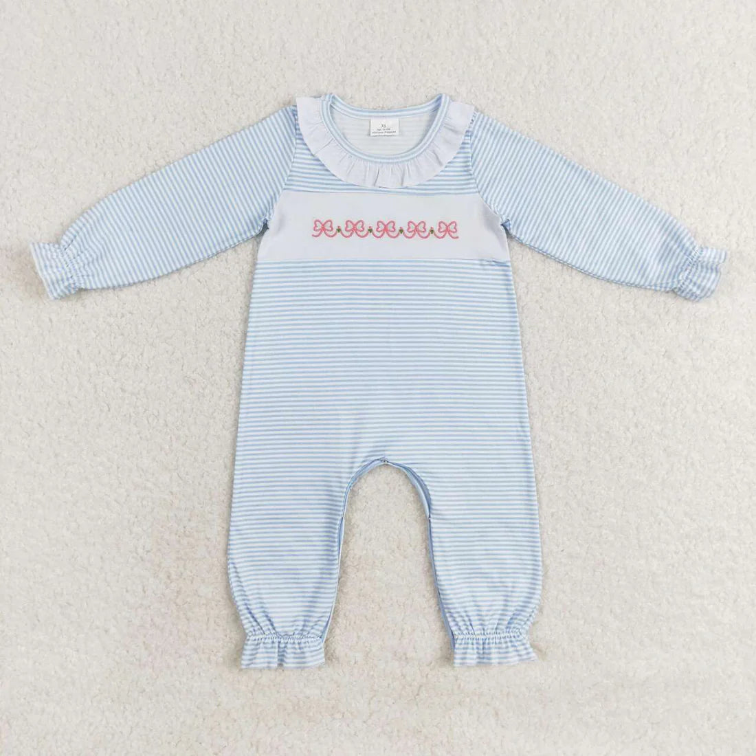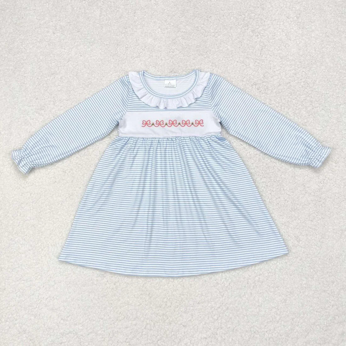 Bows Embroidery Blue Stripes Print Sister Matching Clothes