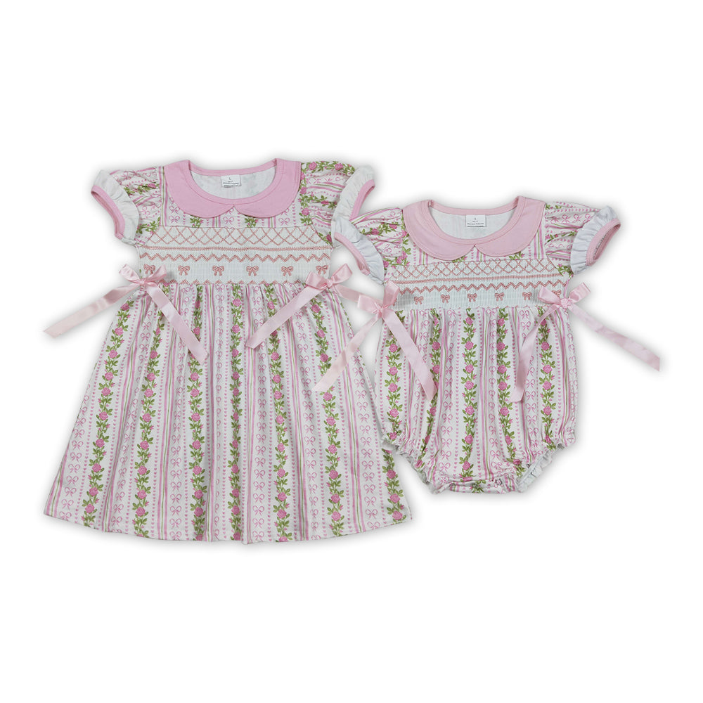 Bows Embroidery Pink Flowers Print Girls Summer Clothes Sisters Smocked Matching Wear