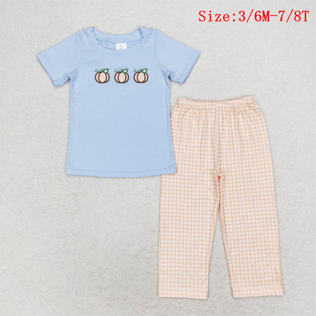 BSPO0371 Pumpkin Embroidery Blue Top Plaid Pants Boys Fall Clothes Set