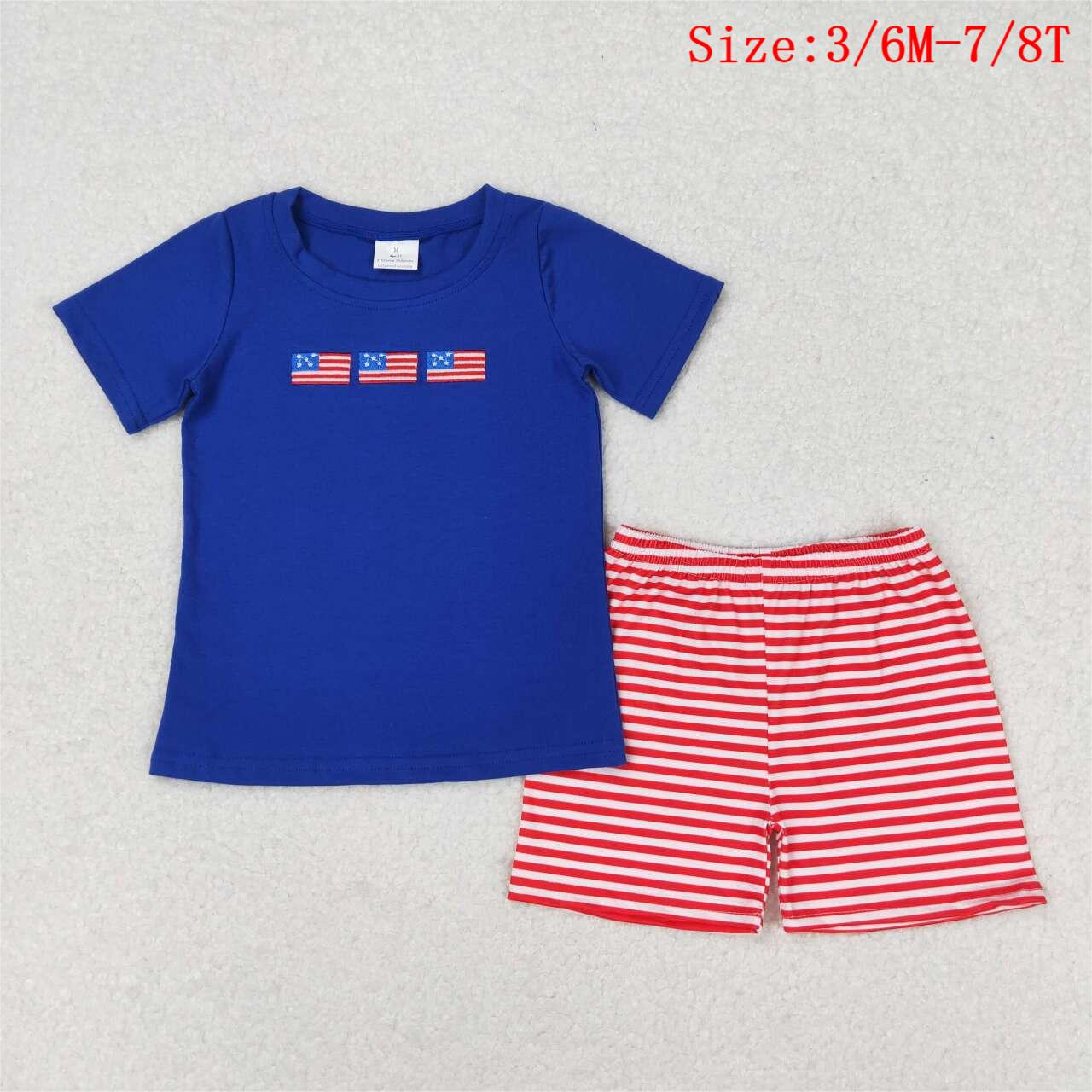 BSSO0434 Flag Embroidery Blue Top Red Stripes Shorts Boys 4th of July Clothes Set