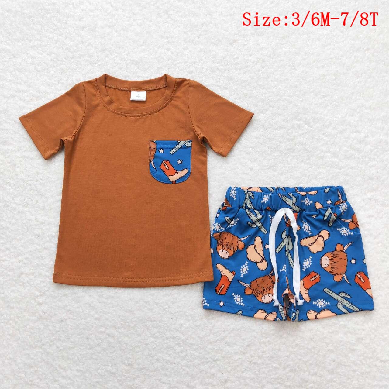 BSSO0542 Brown Pocket Top Highland Cow Cactus Shorts Boys Western Summer Clothes Set