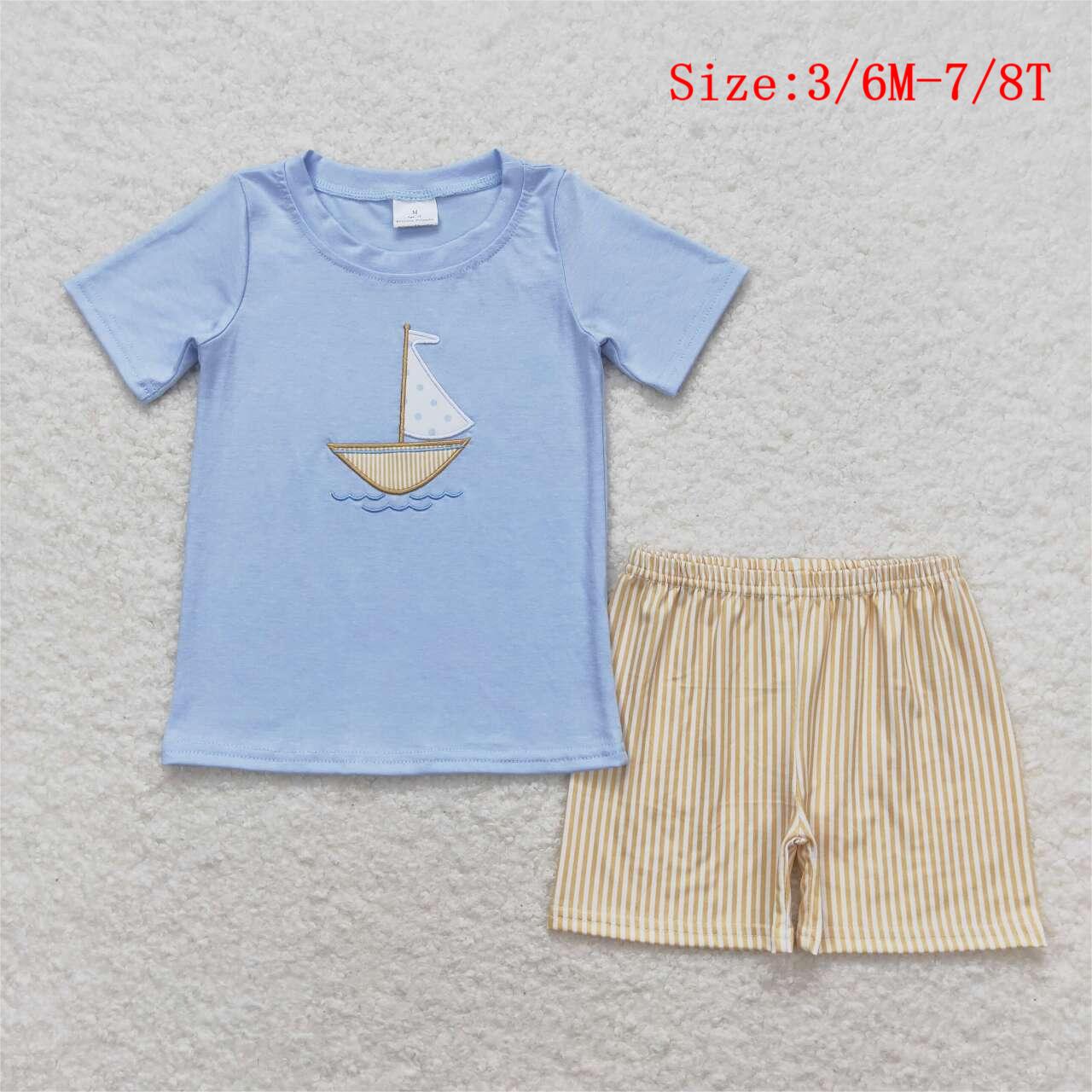 BSSO0602 Sailboat Embroidery Blue Top Stripes Shorts Boys Summer Clothes Sets