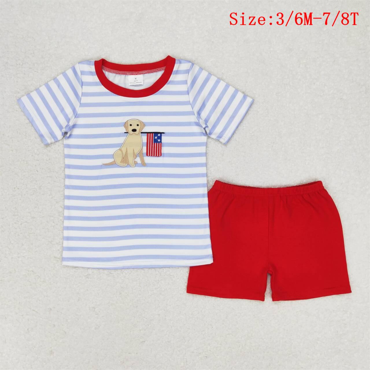 BSSO0619 Dog Flag Embroidery Stripes Top Red Shorts Boys 4th of July Clothes Set