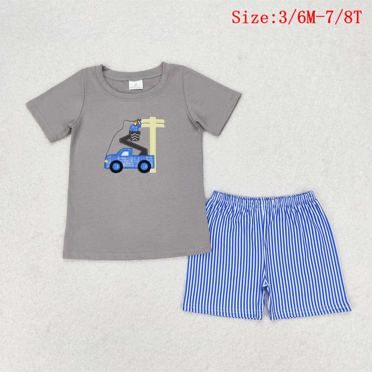 BSSO0631 Worker Embroidery Grey Top Stripes Shorts Boys Summer Clothes Set
