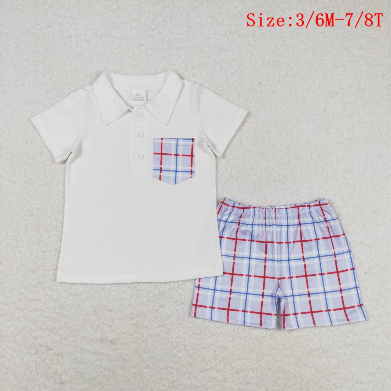 BSSO0651 White Pocket Polo Top Plaid Shorts Boys Summer Clothes Set