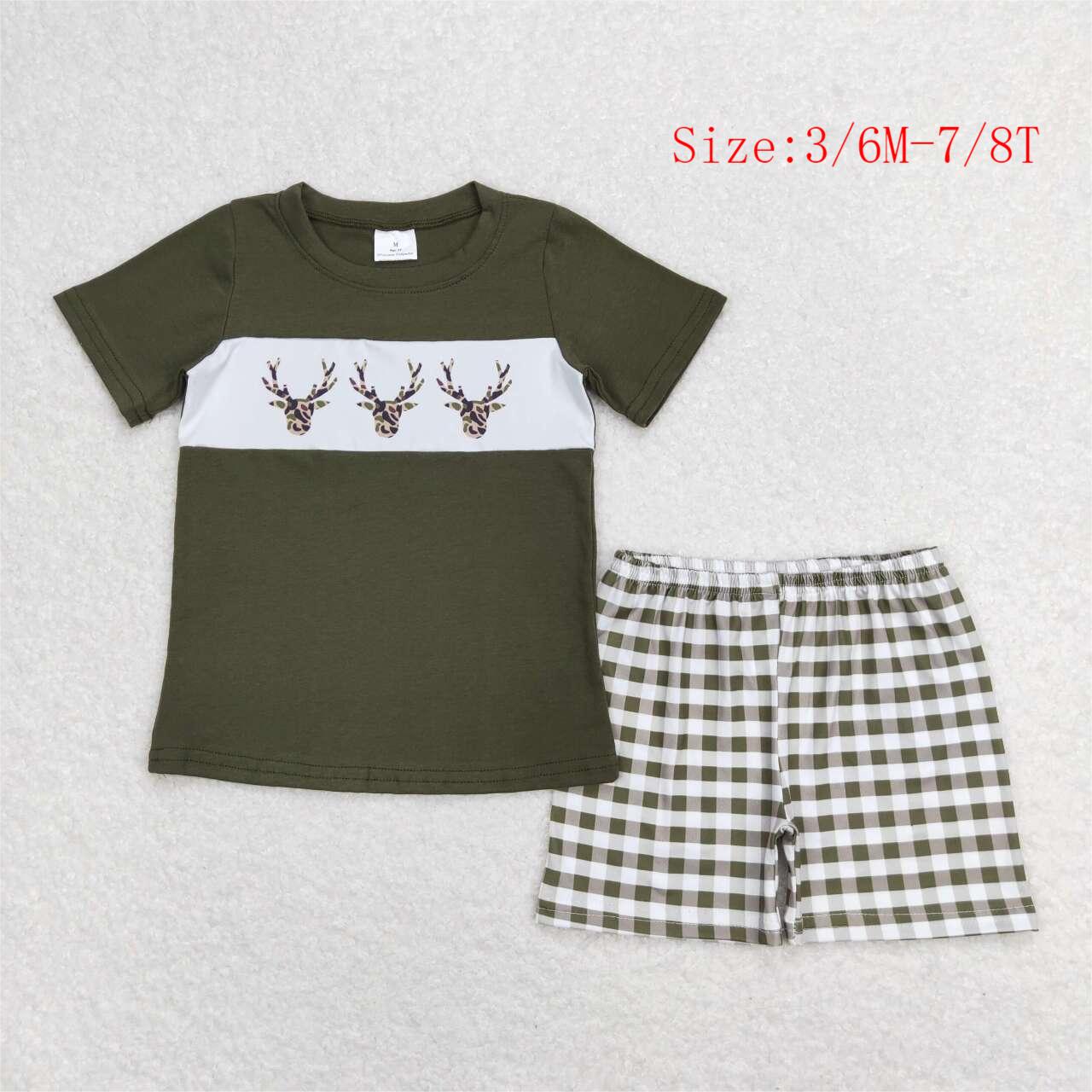 BSSO0662 Green Camo Deer Top Plaid Shorts Boys Summer Clothes Set