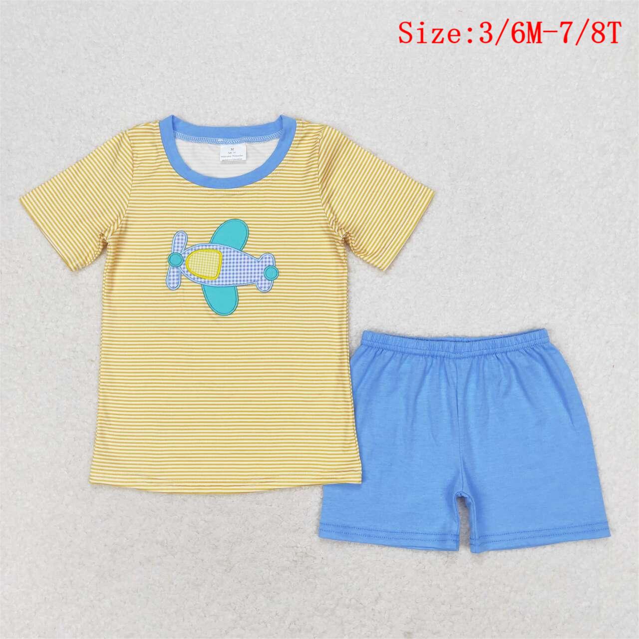 BSSO0724 Plane Embroidery Stripes Print Blue Shorts Boys Summer Clothes Set