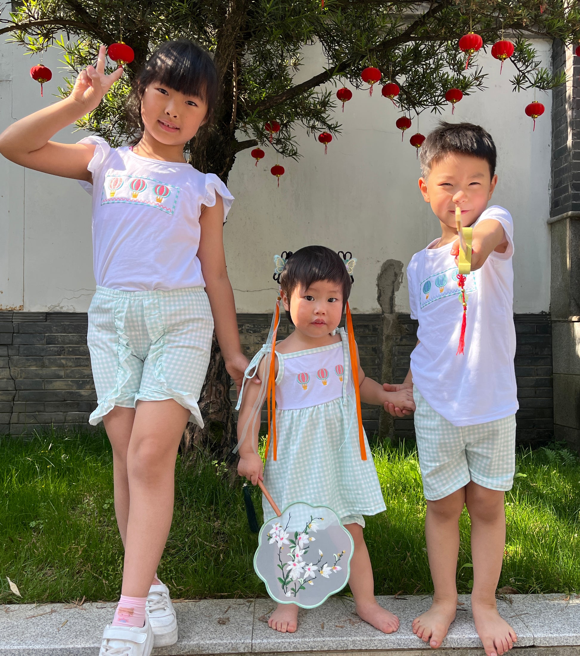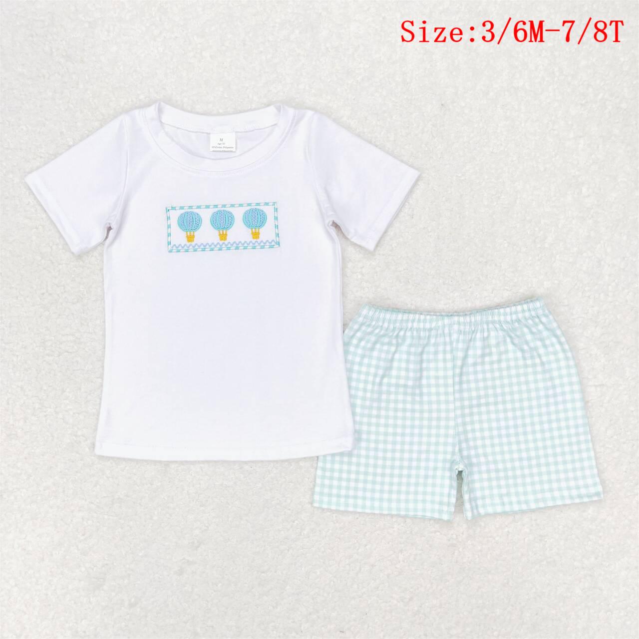 BSSO0784 Hot Air Balloon Embroidery Top Plaid Shorts Boys Summer Clothes Set