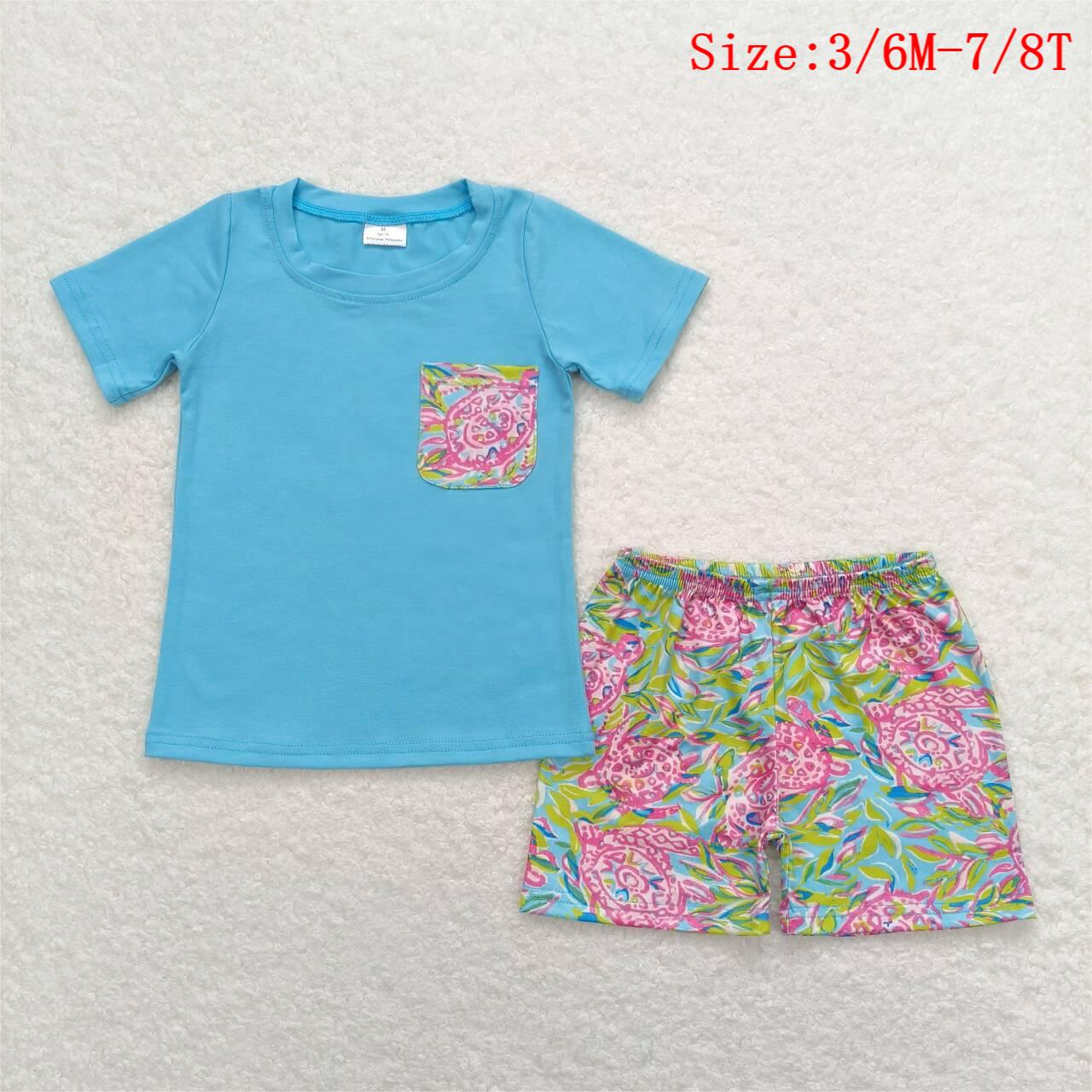 BSSO0846 Blue Pocket Top Turtle Seaweed Shorts Boys Summer Clothes Set