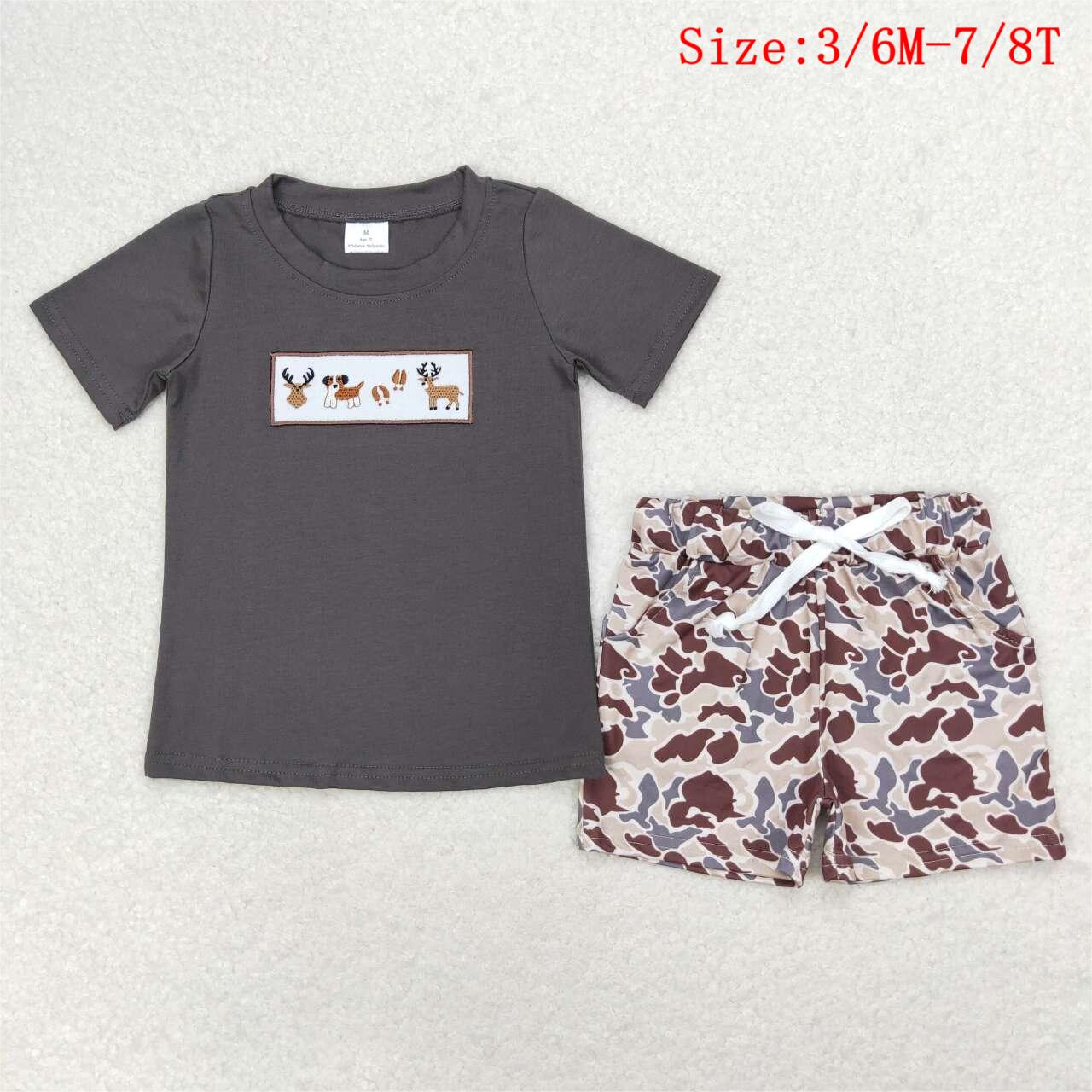 BSSO0969 Deer Dog Embroidery Top Camo Shorts Boys Summer Clothes Set