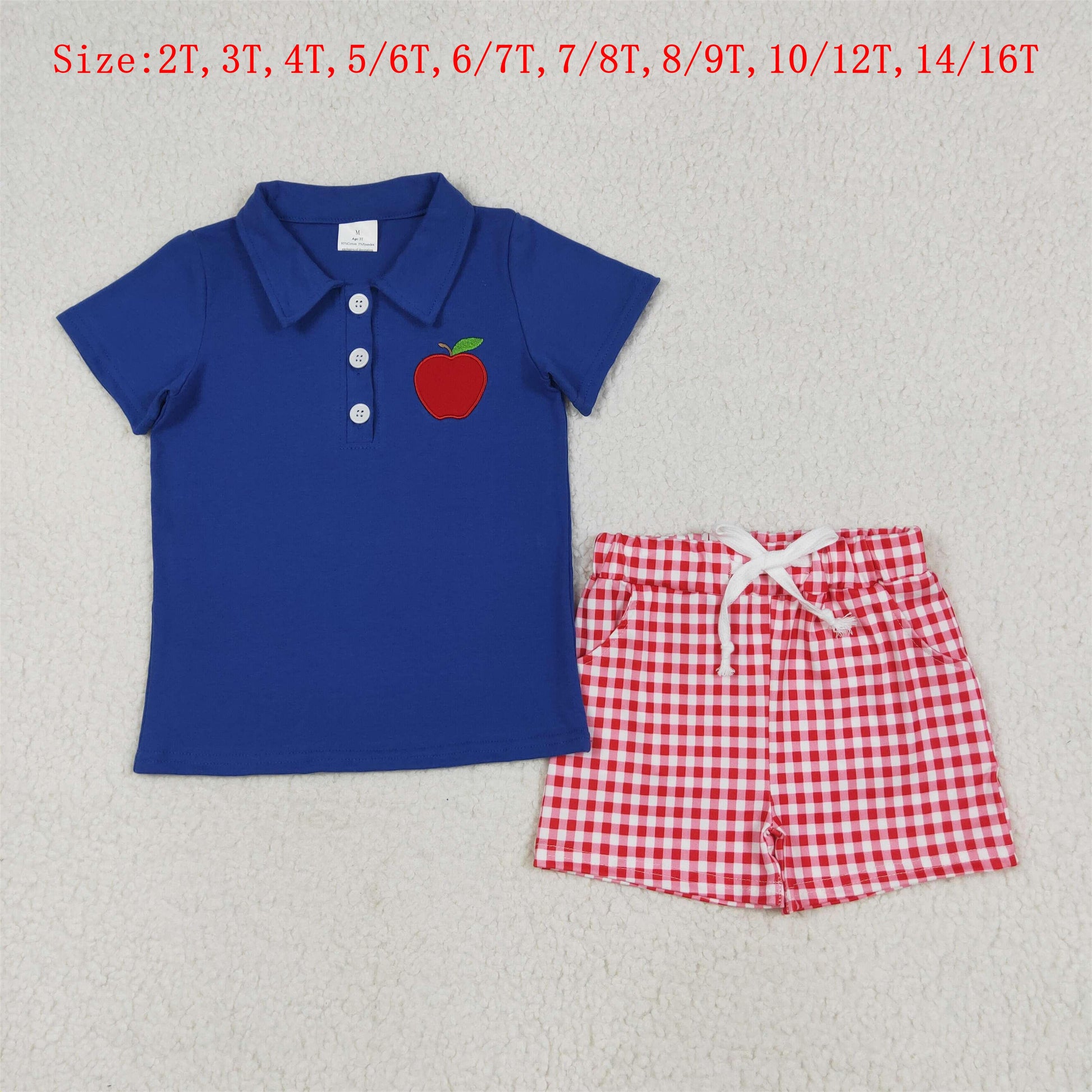 BSSO1397 Apple Embroidery Blue Polo Top Red Plaid Shorts Boys Back to School Clothes Set