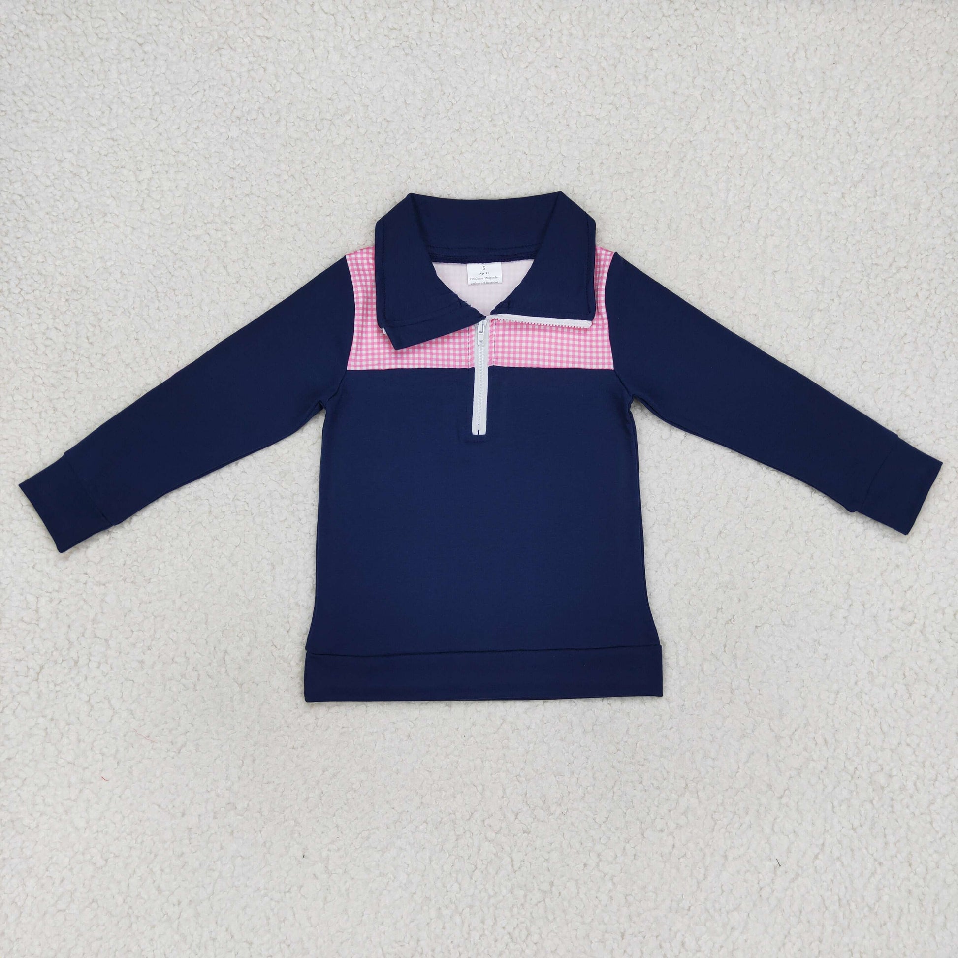 BT0290 Boys Pink Plaid Long Sleeve Elbow Navy Pullover Zipper Tee Shirt Top