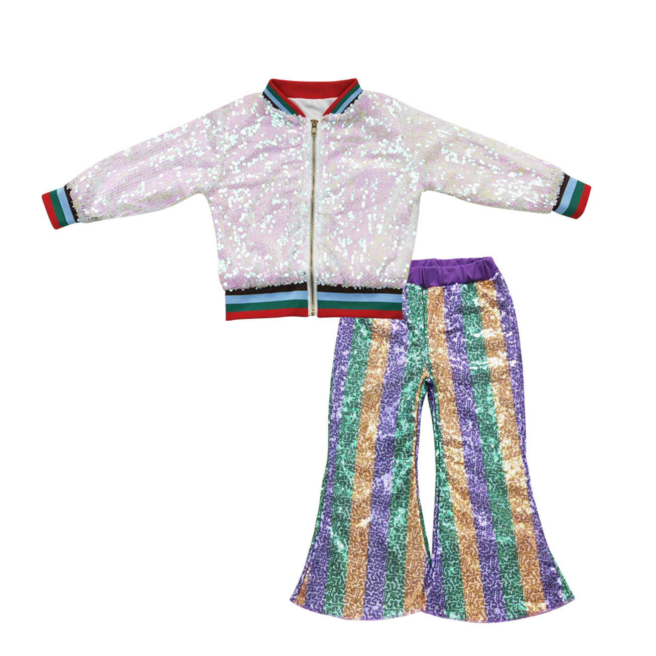 BT0294+P0277 White Pink Sparkle Sequin Jackets Top Green Golden Purple Stripes Sequin Bell Pants Girls Fall Clothes Set