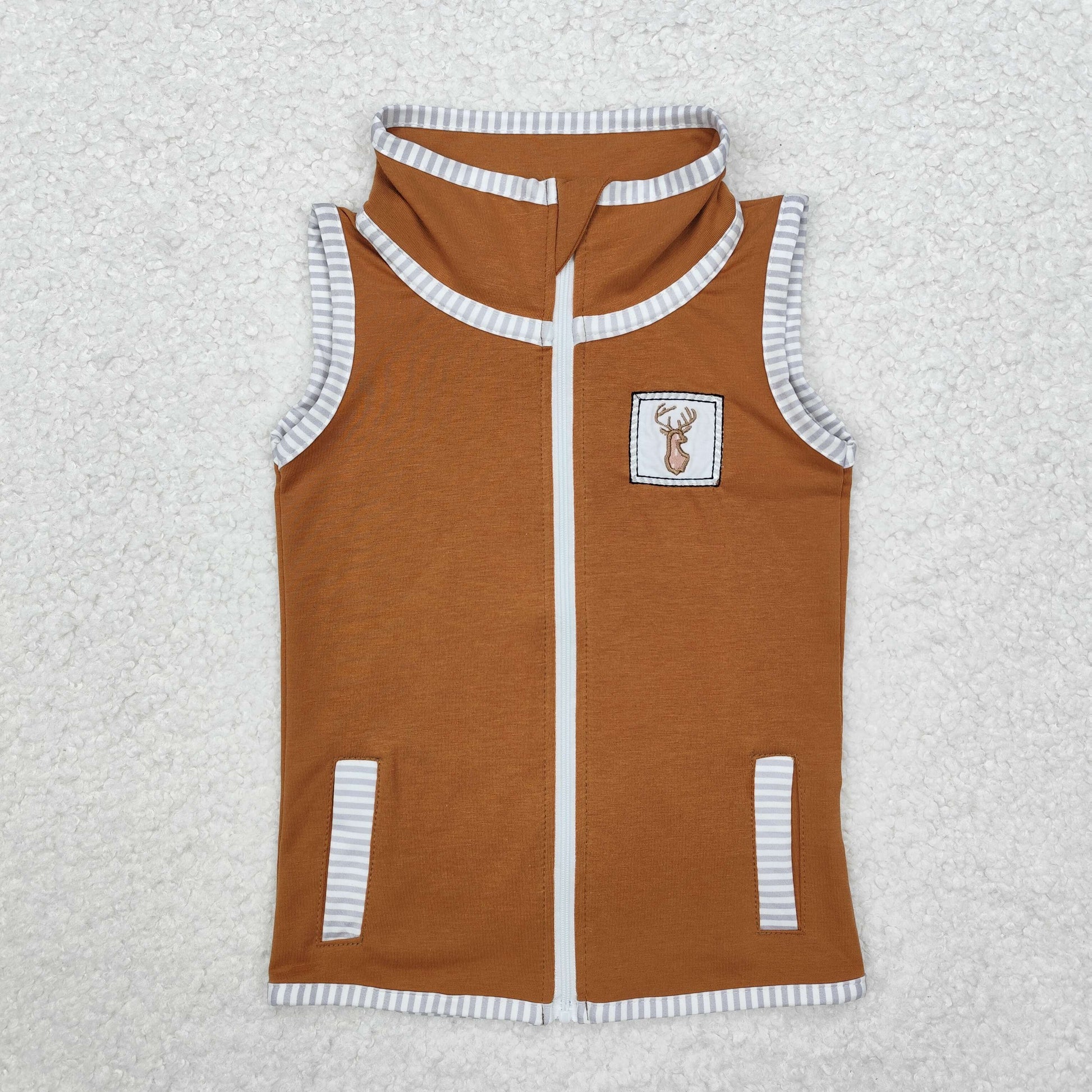 BT0855 Deer Embroidery Brown Stripes Print Kids Zipper Jacket Fall Vest Tops