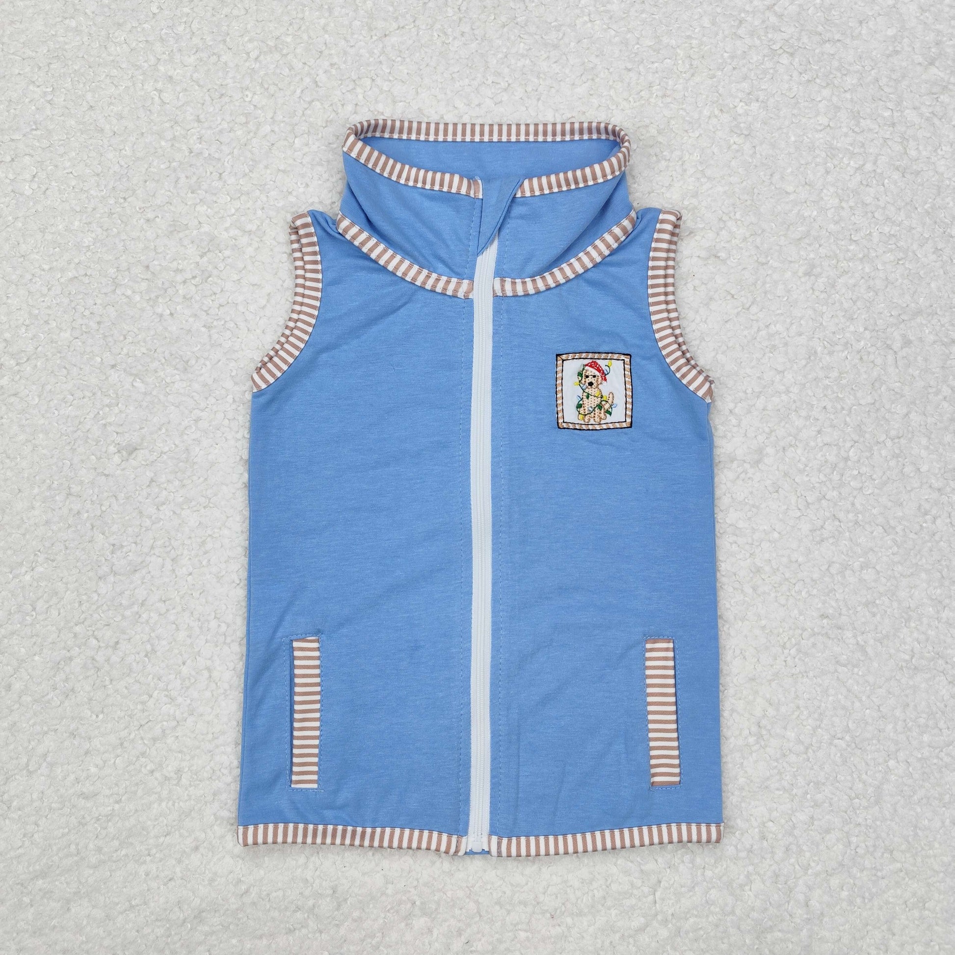 BT0860 Dog Lights Embroidery Stripes Print Blue Color Kids Zipper Jacket Christmas Vest Tops